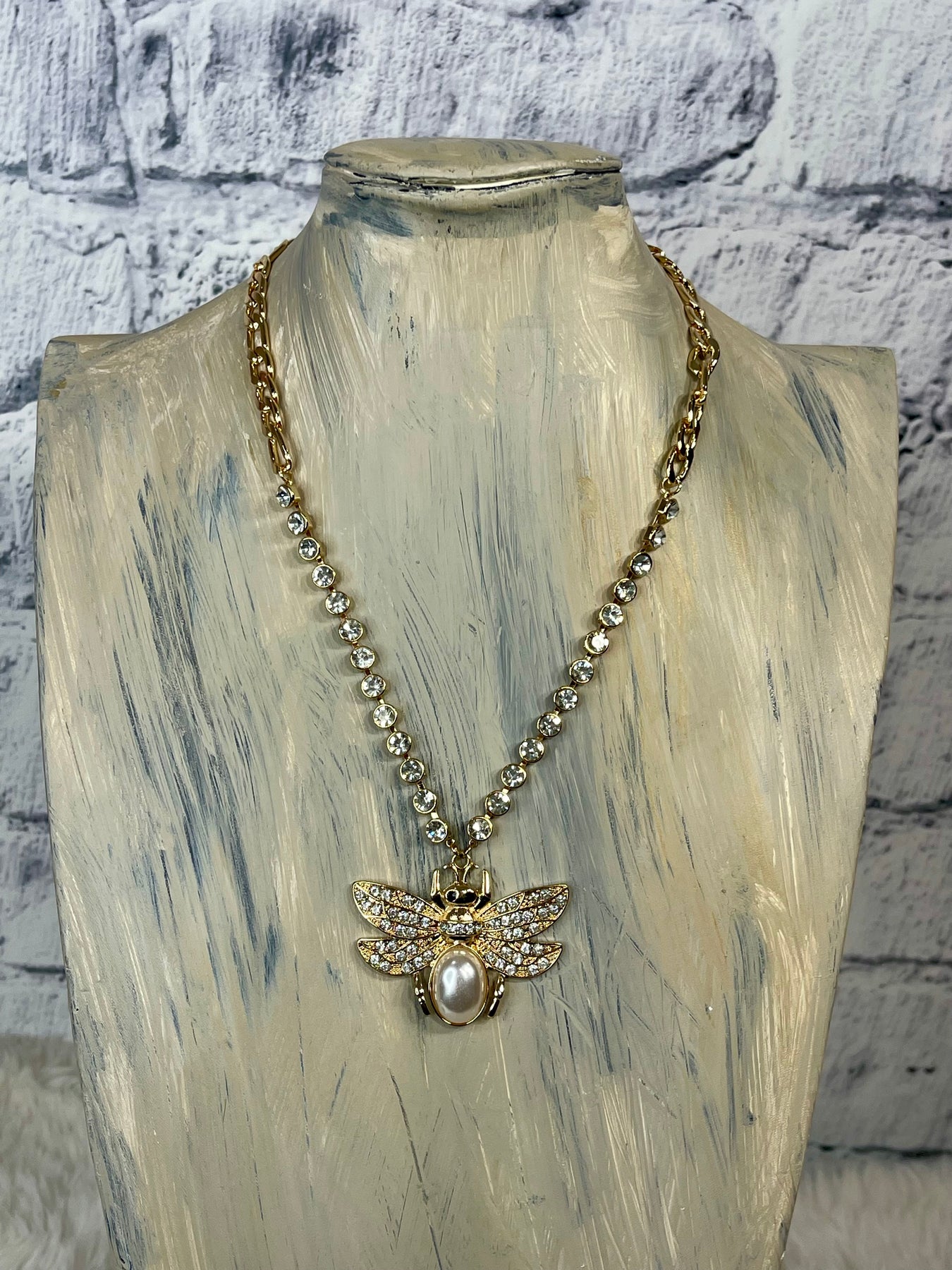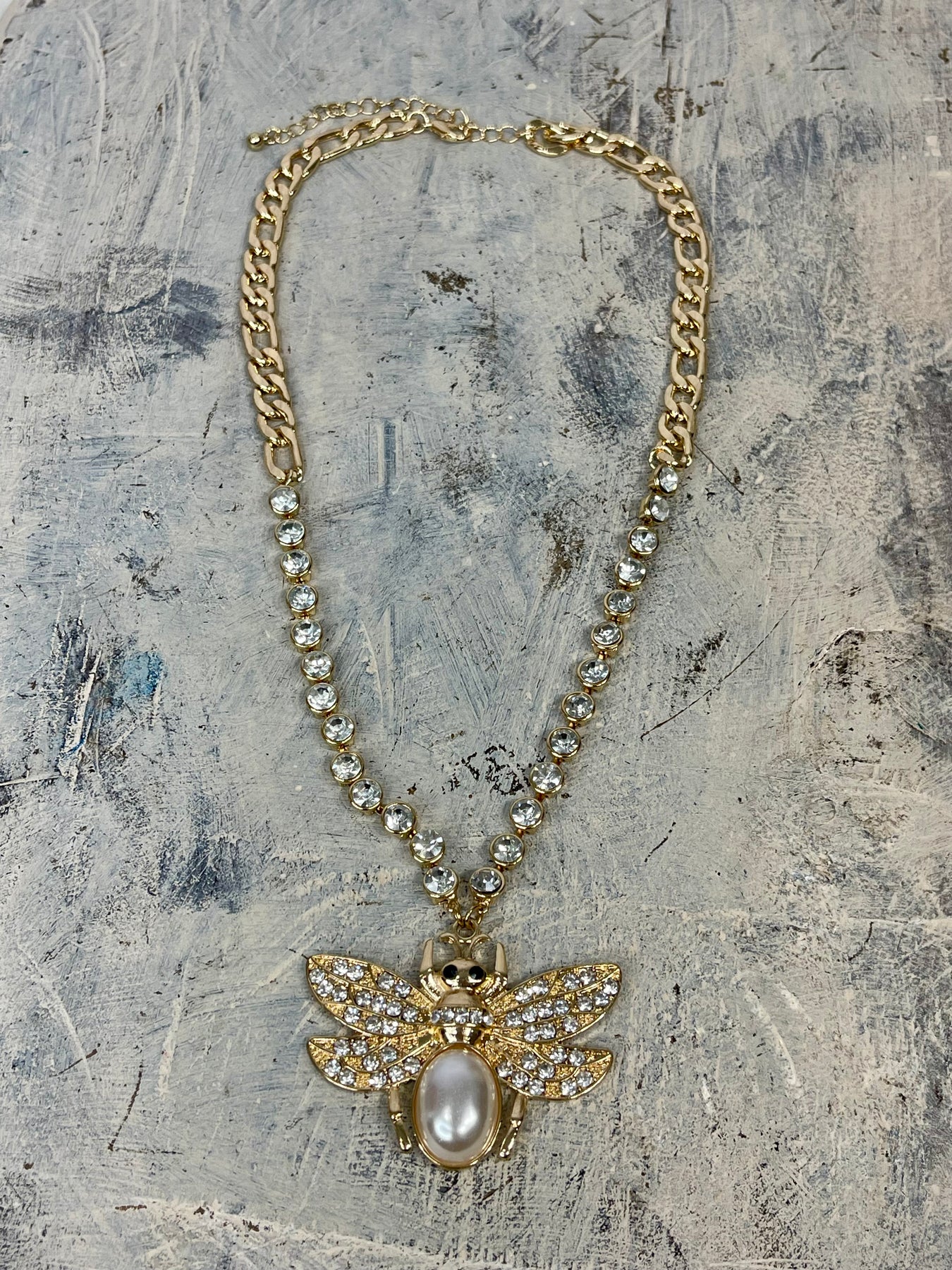 Bee Mine pearl crystal chain necklace- Gold/Clear crystal