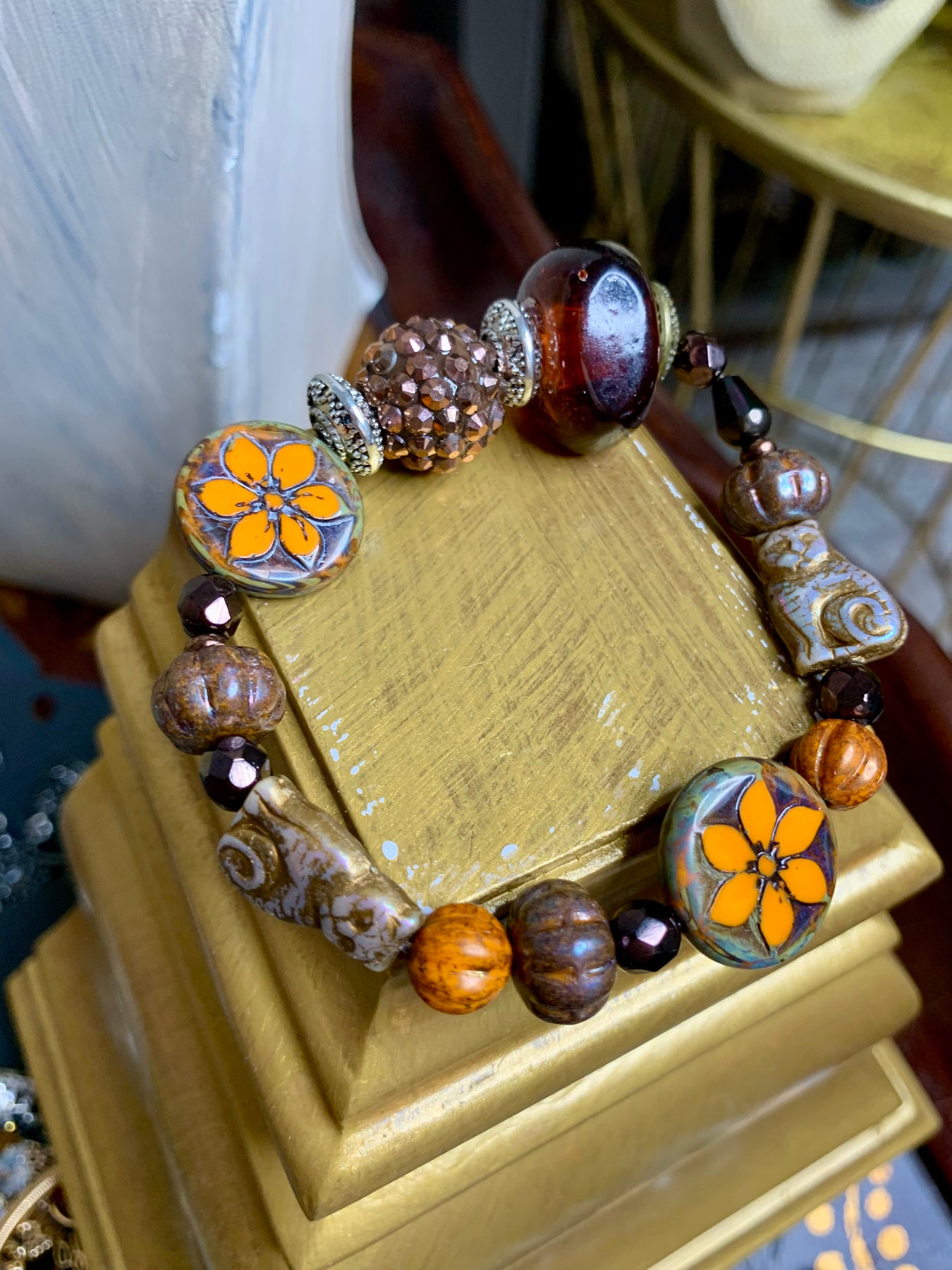 Harvest Moon Cat and Multi Bead Bracelet - Neutral Mix