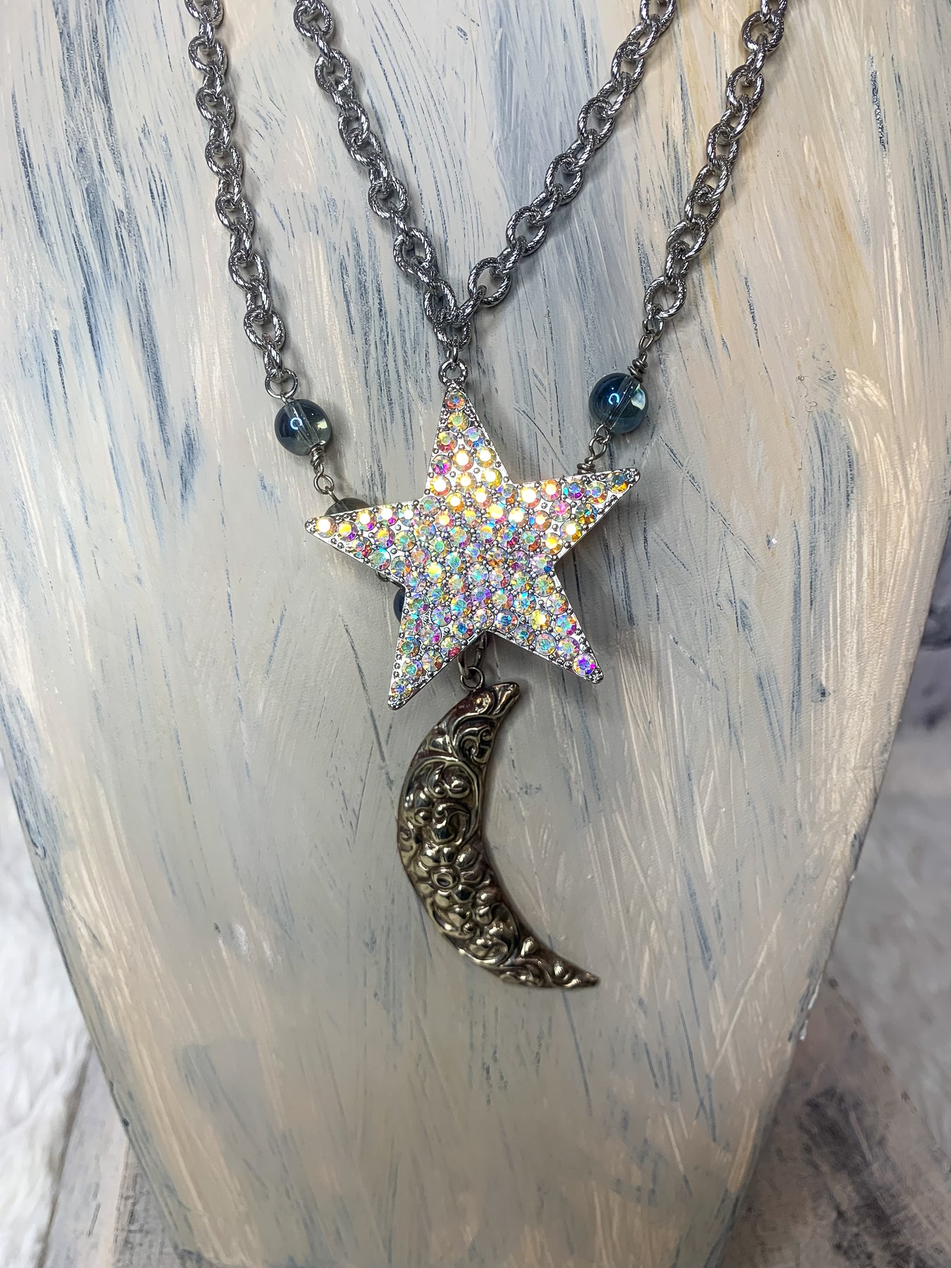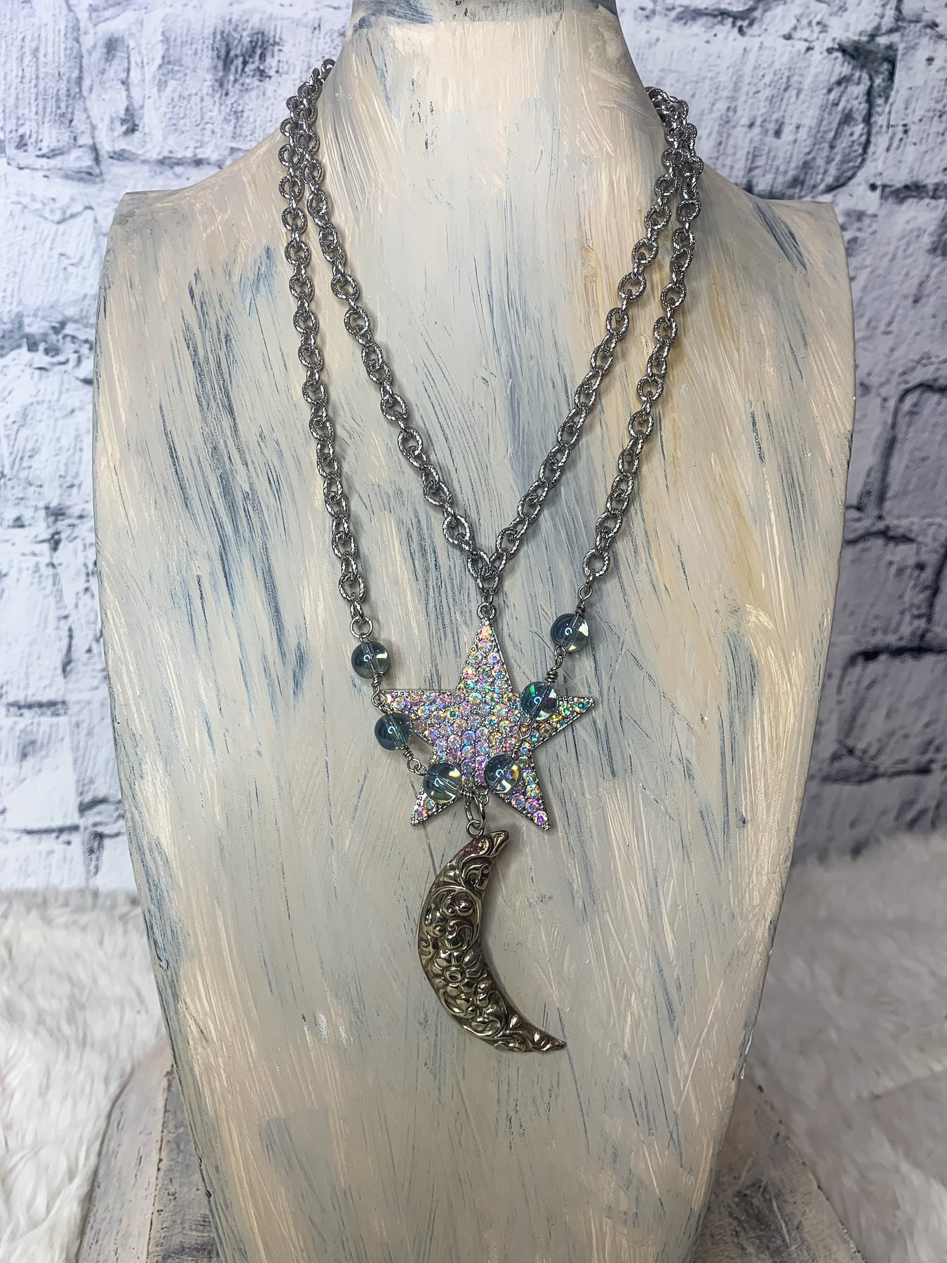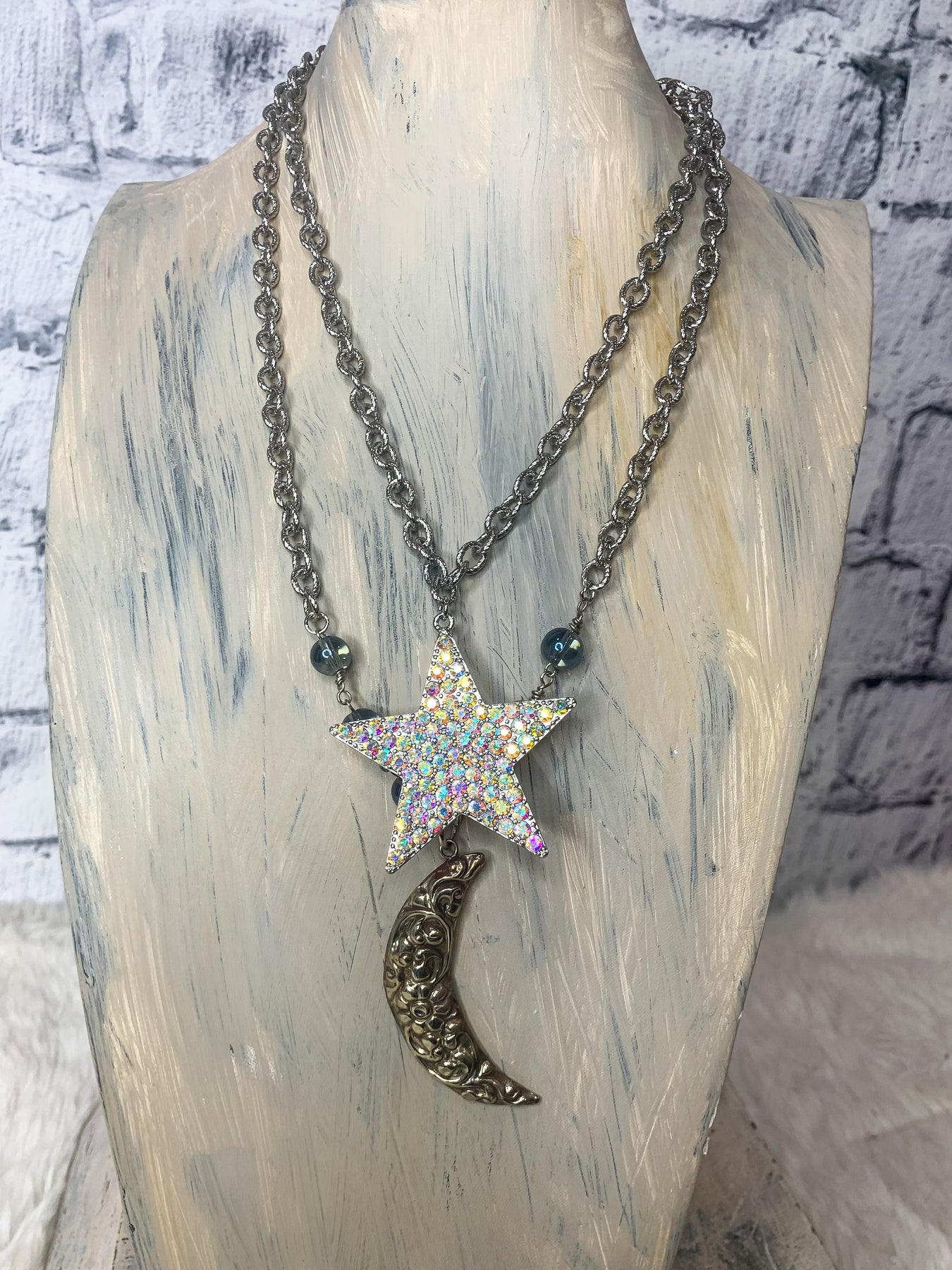 Luna Tibetan Silver Moon and AB Star Pendant Quartz Glass Bead Layered Necklace