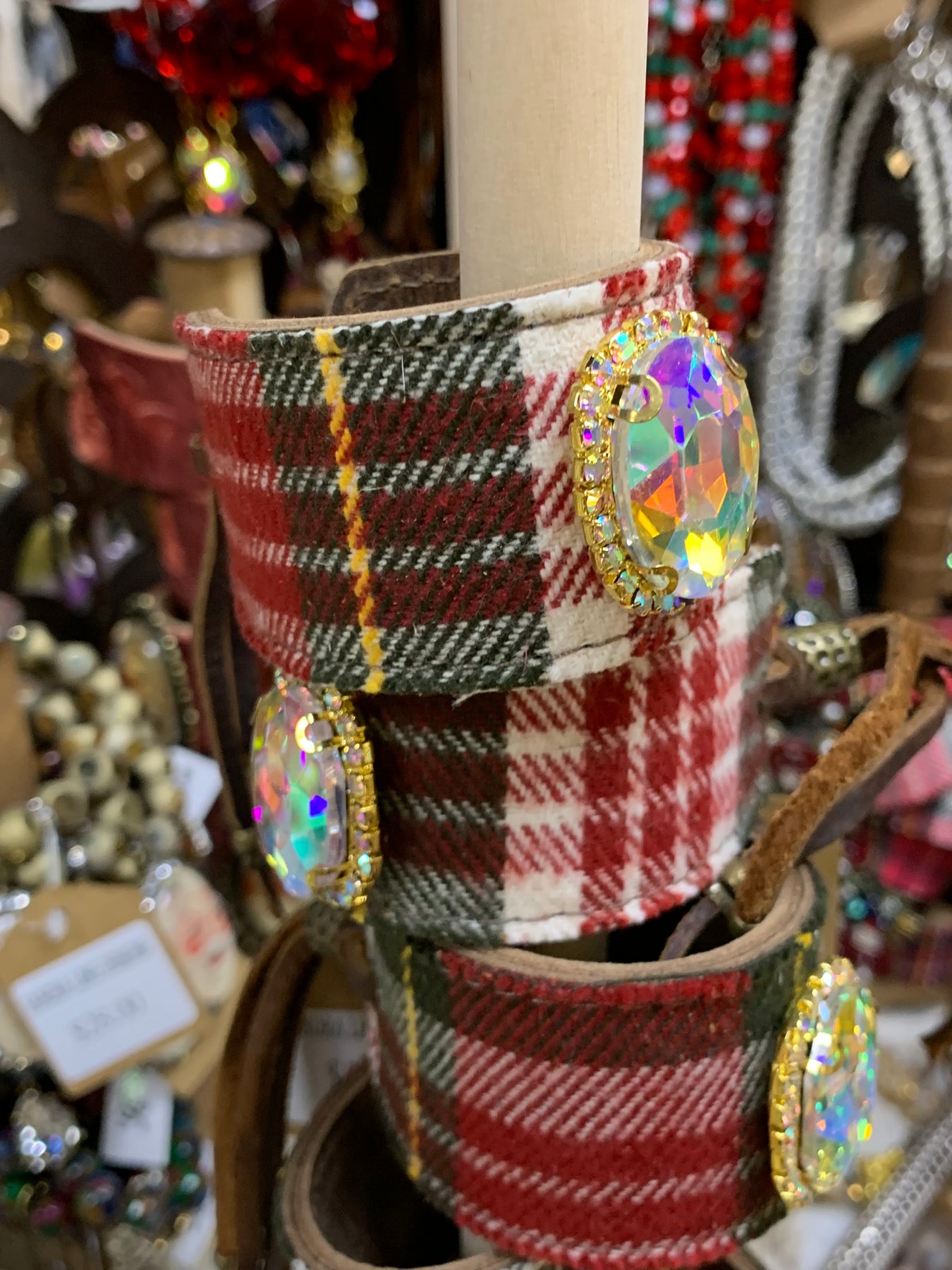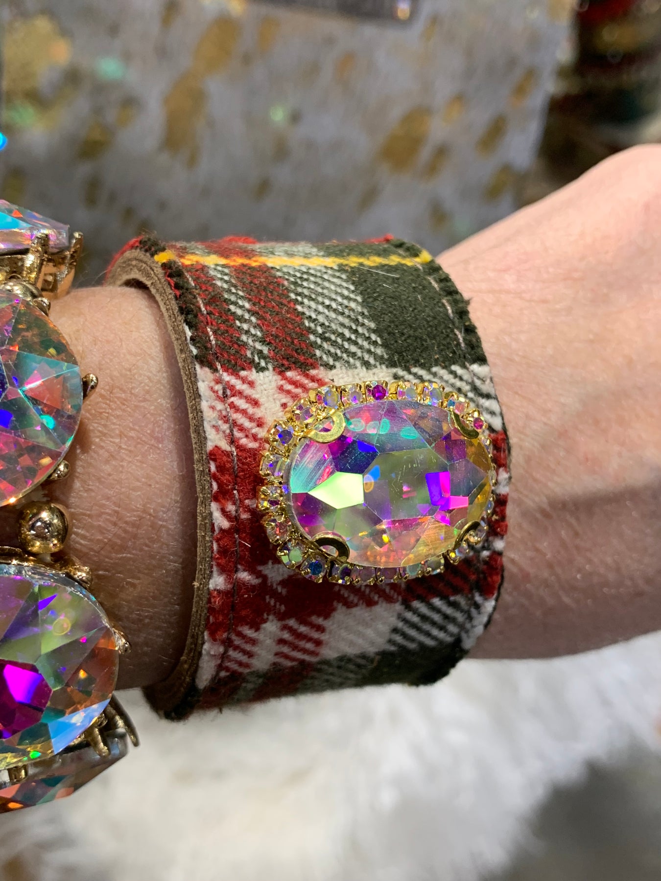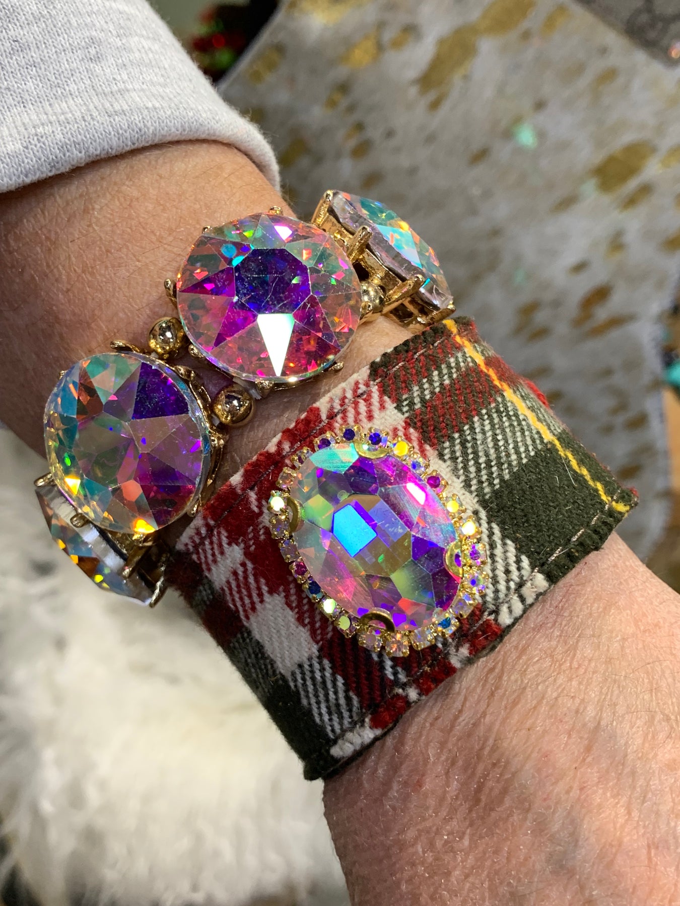 Christmas Plaid AB oval crystal Bracelet - Gold/red mix