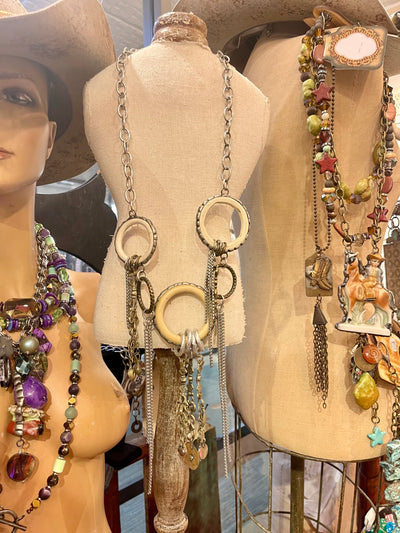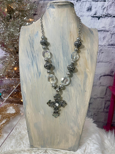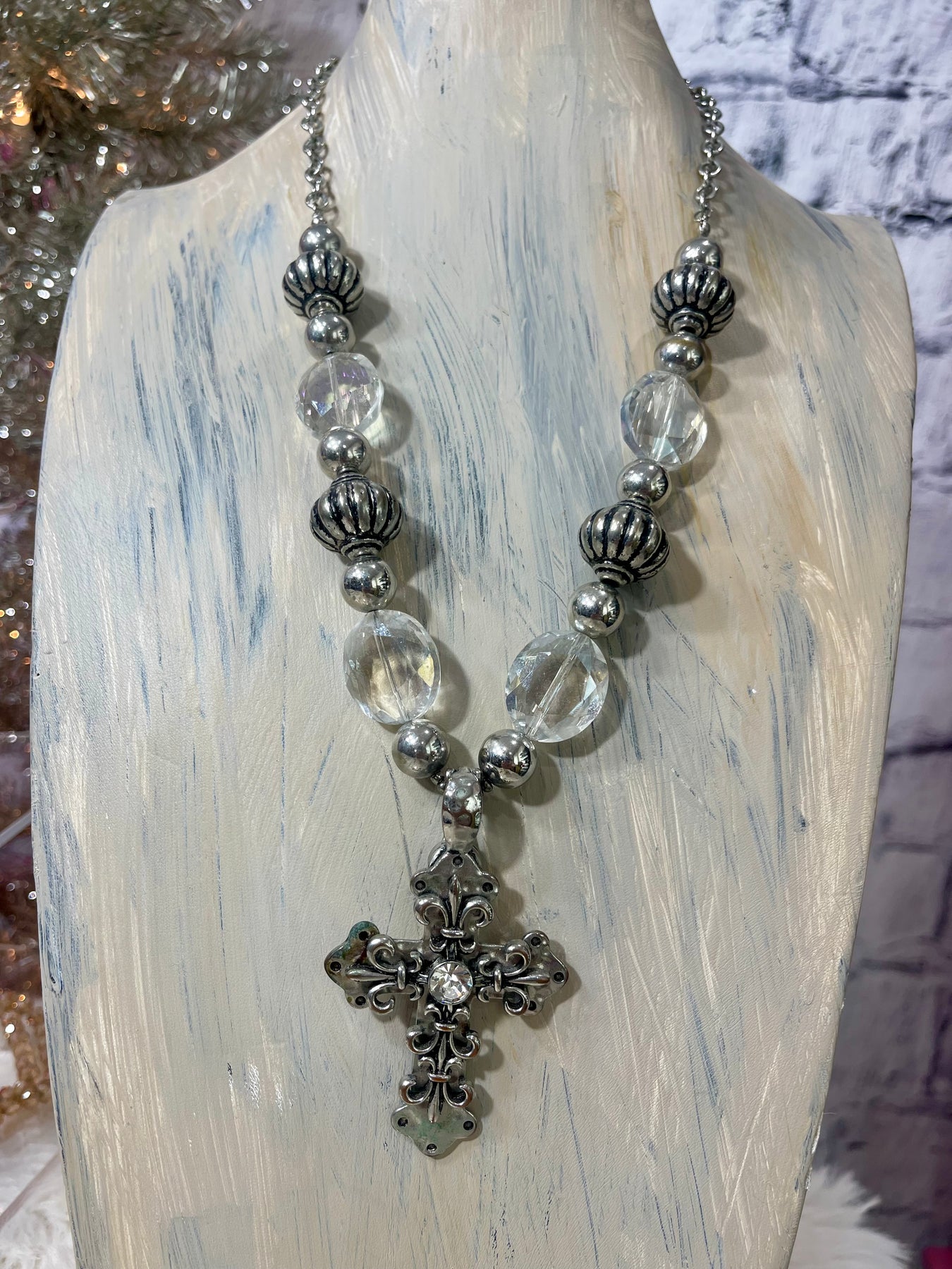 Rustic Chunky Stone Cross Charm Necklace -Gunmetal/Silver