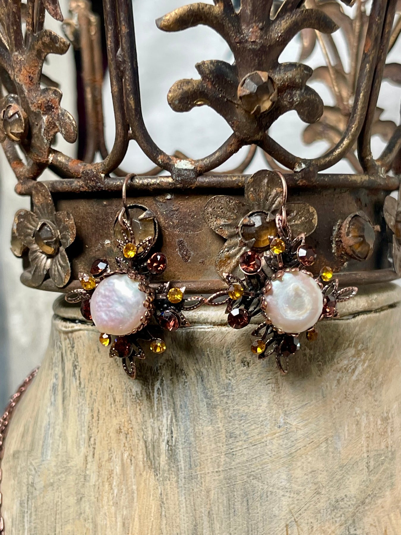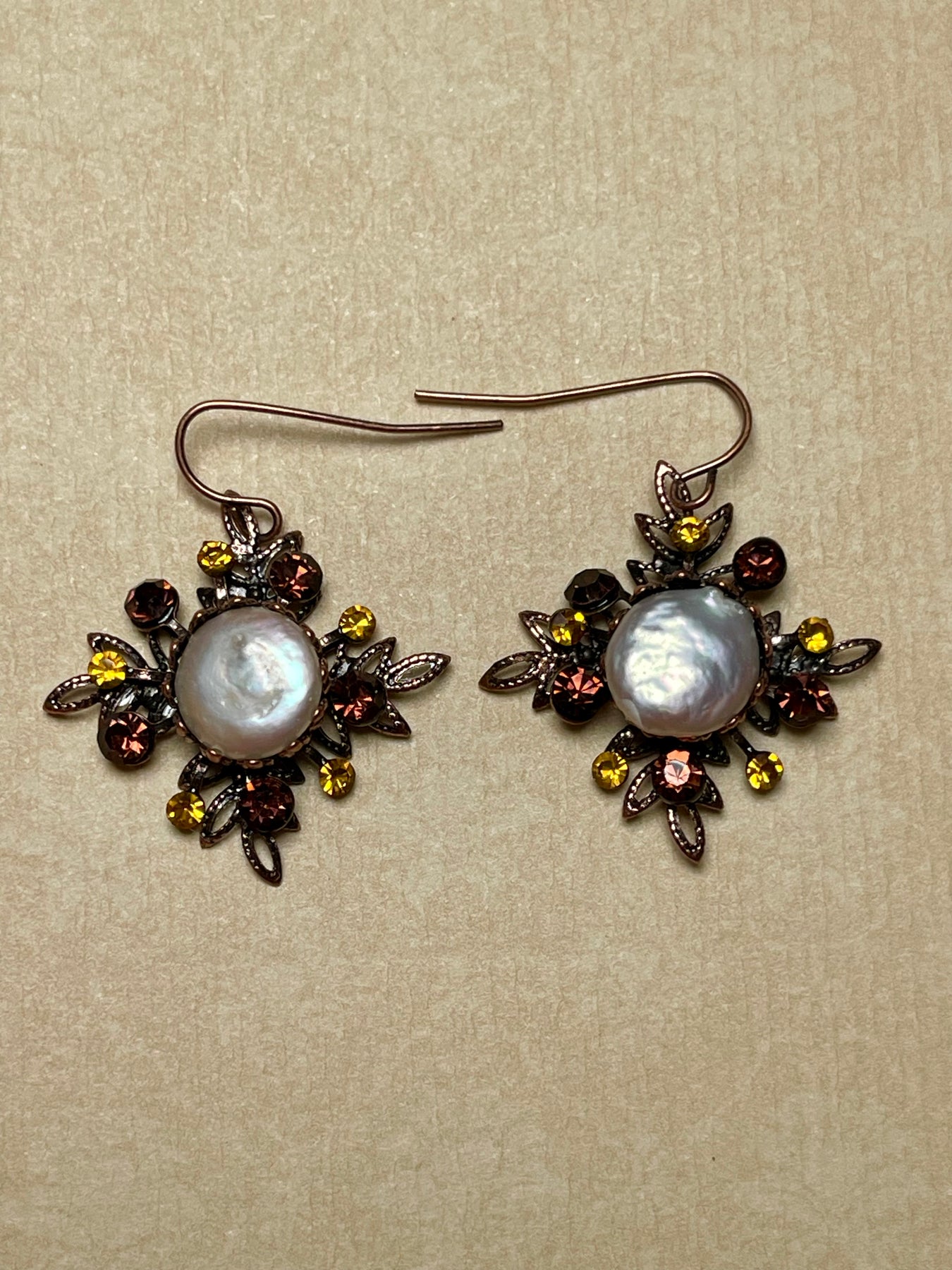 Fresh Water Pearl Detail Bling Flower Earrings - Bronze