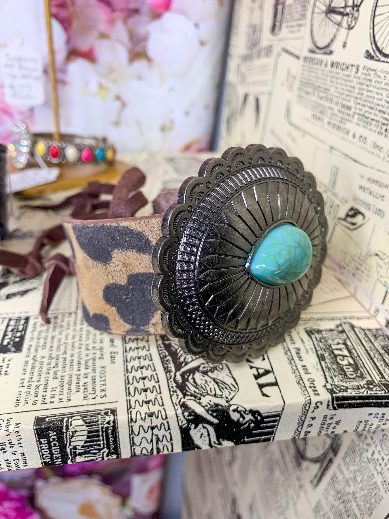 Leopard Squash Blossom Leather Cuff