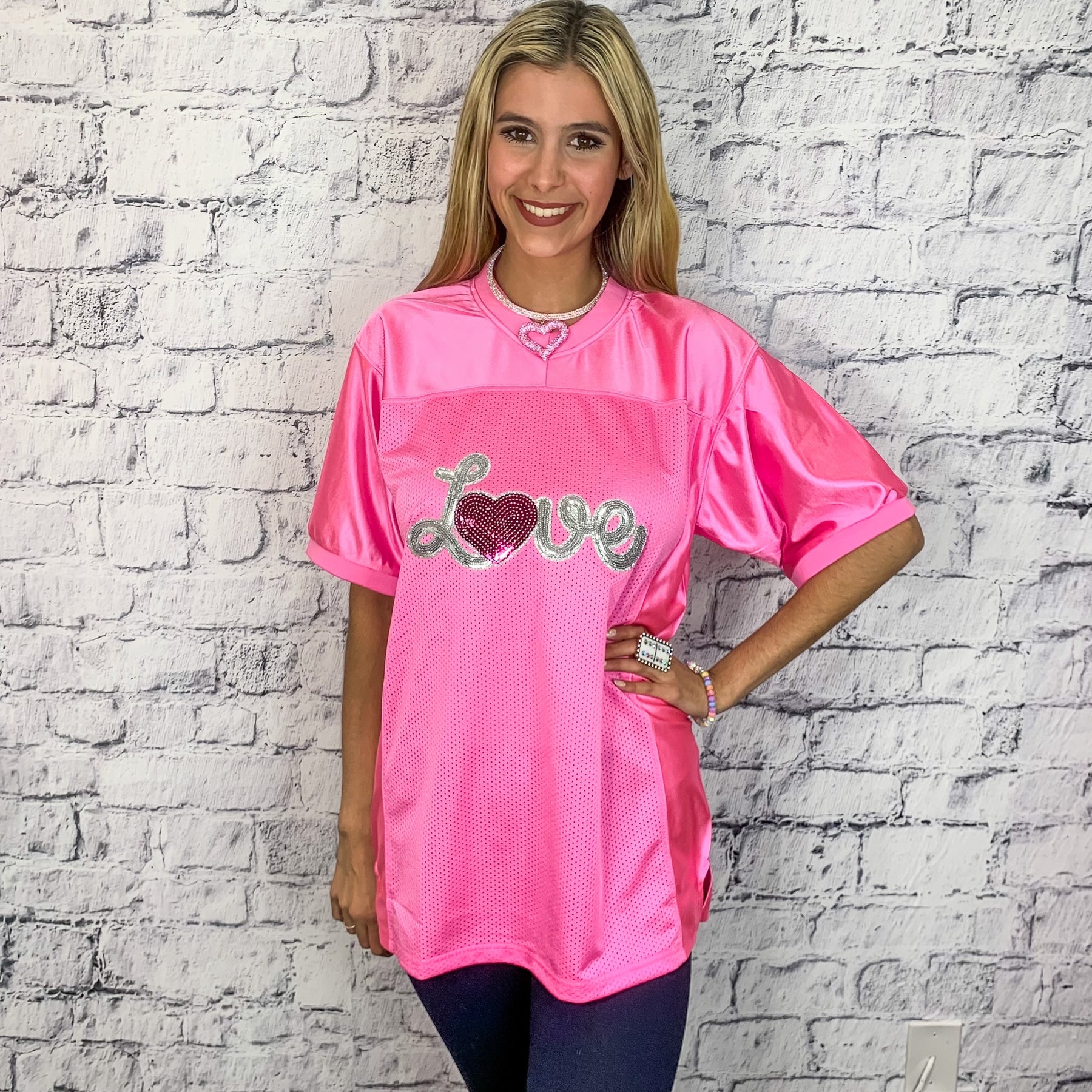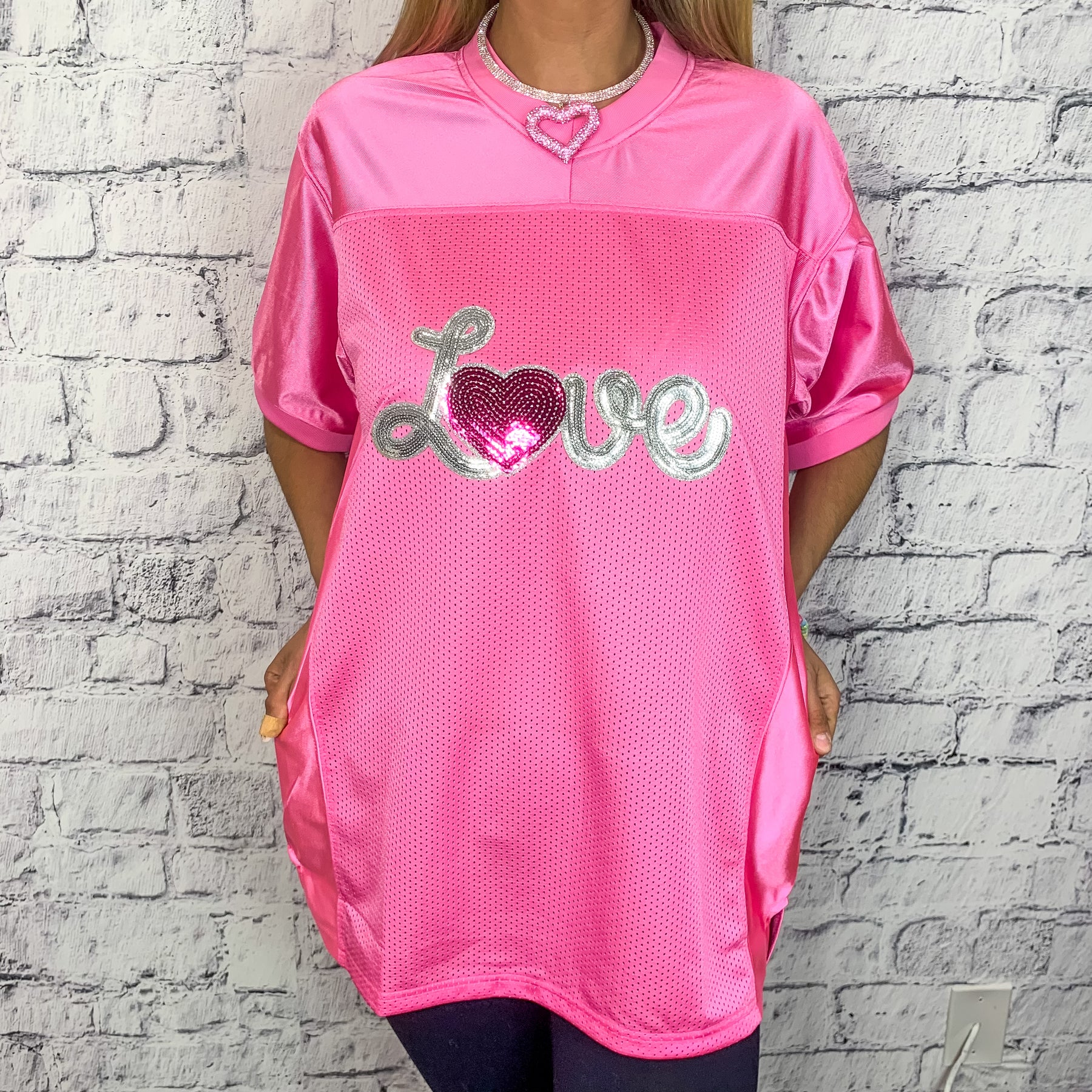 Love Sequin Graphic Football Jersey - Pink
