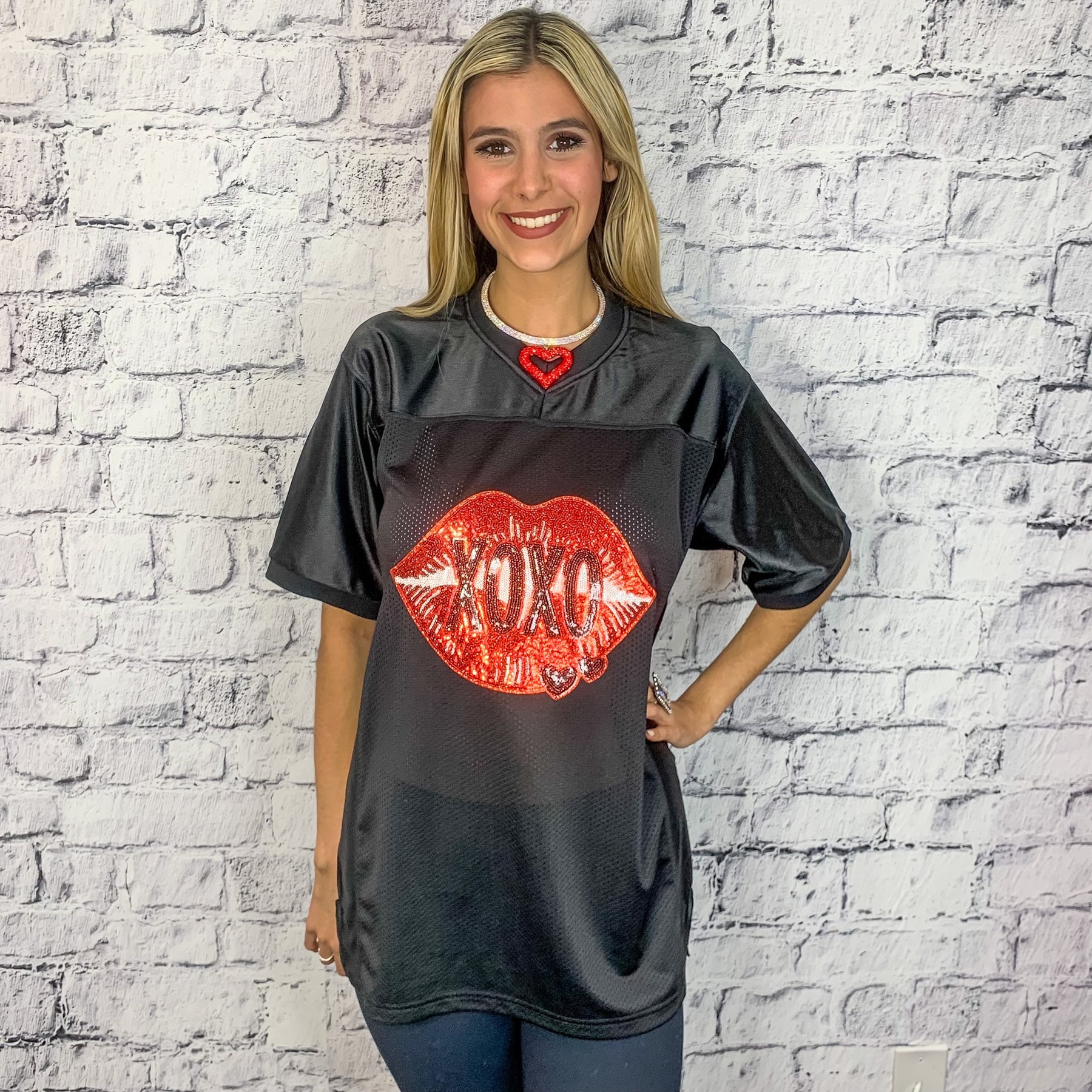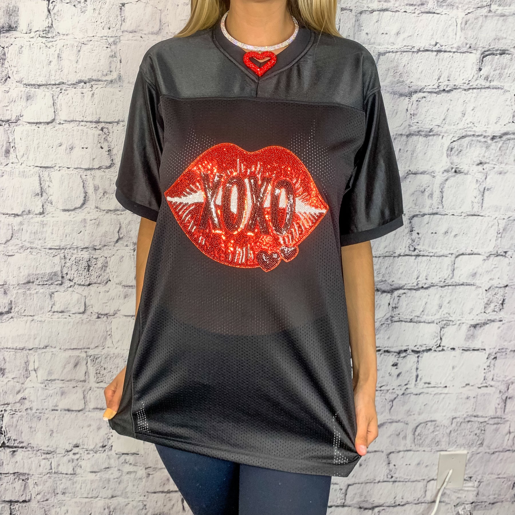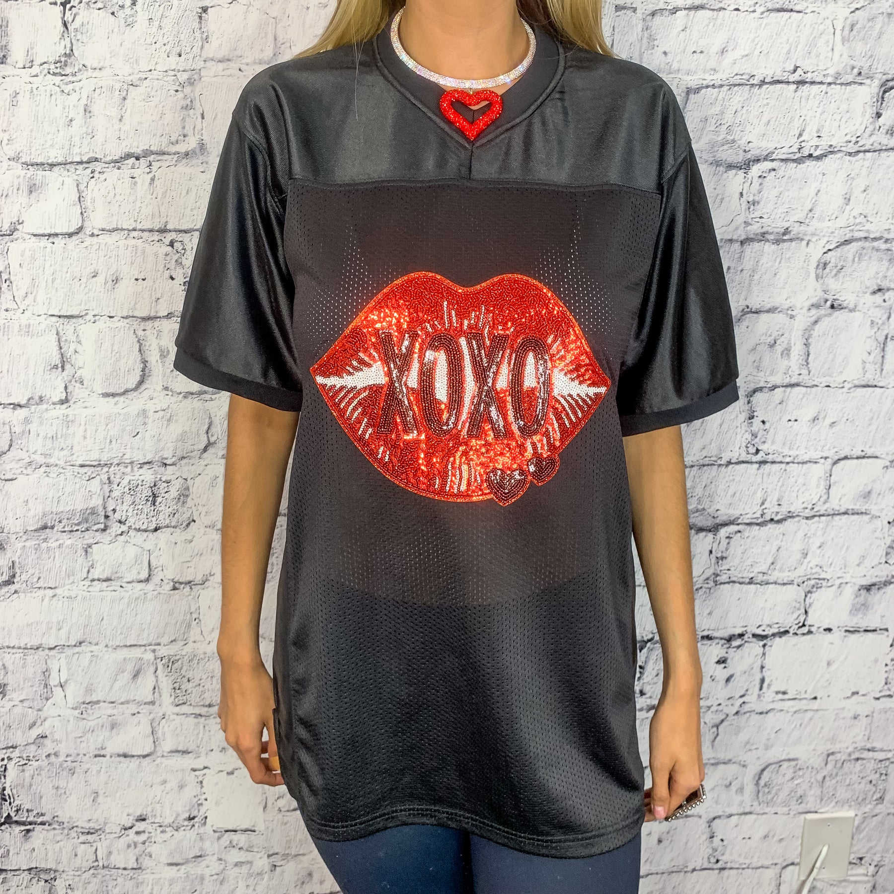 XOXO Lips Sequin Graphic Football Jersey - Black