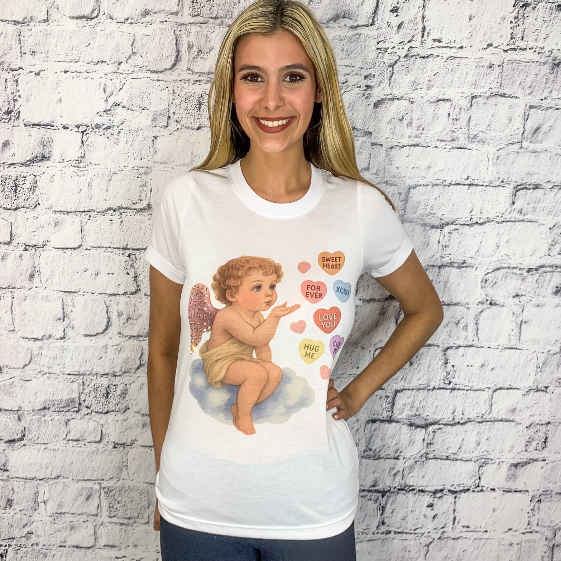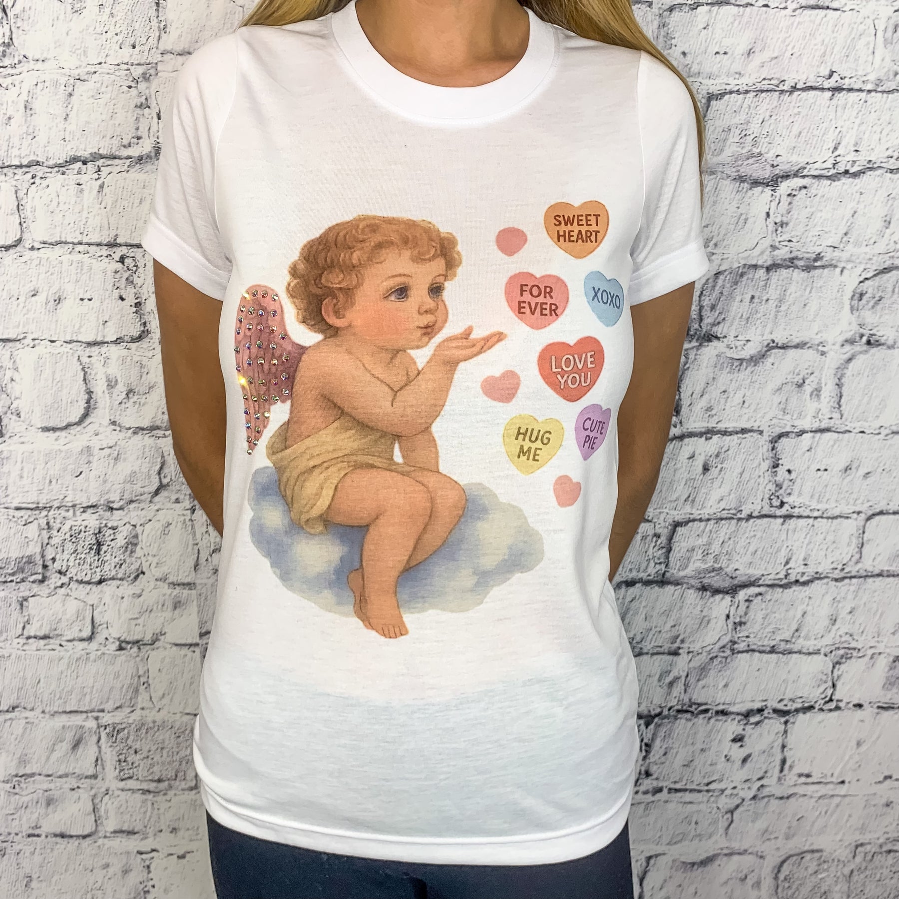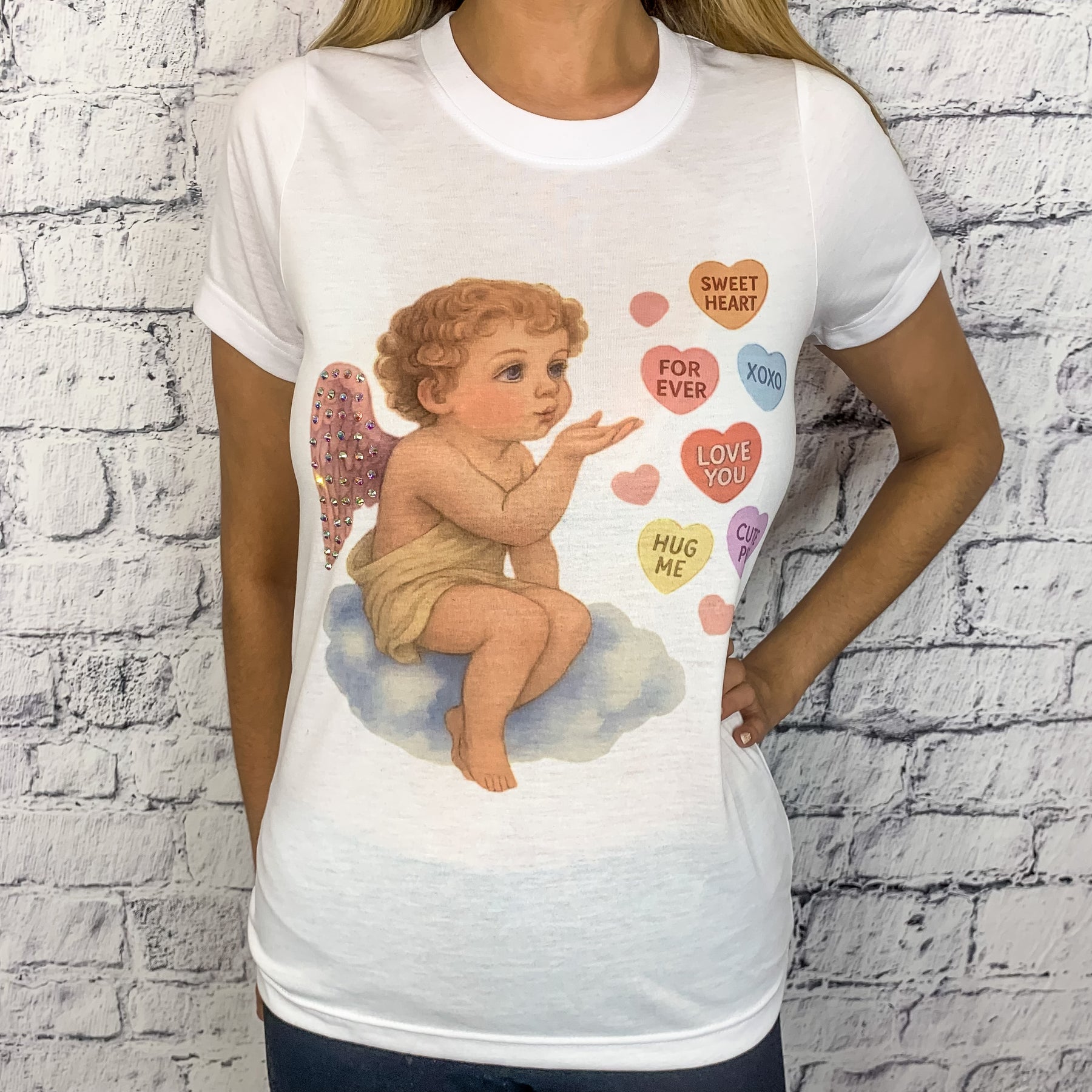 Cupid Candy Heart Kisses AB Embellished Graphic Tee - White