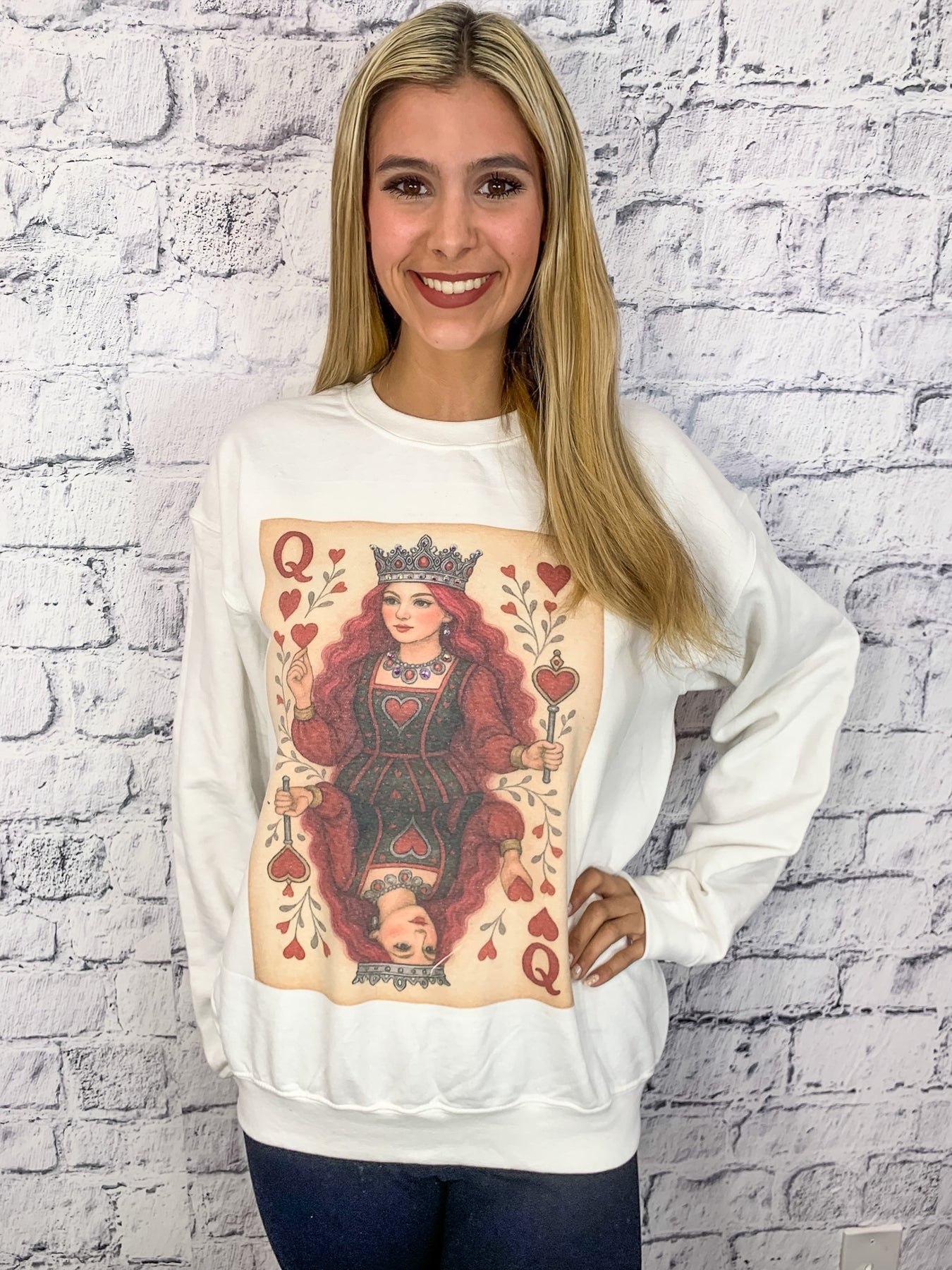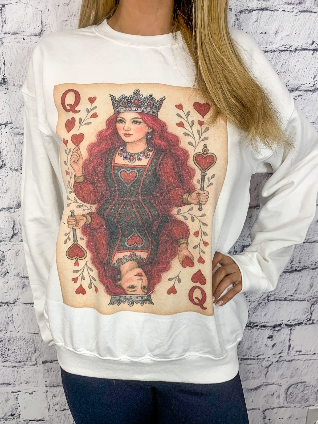 Queen of Hearts AB Embellished Graphic Pullover - White