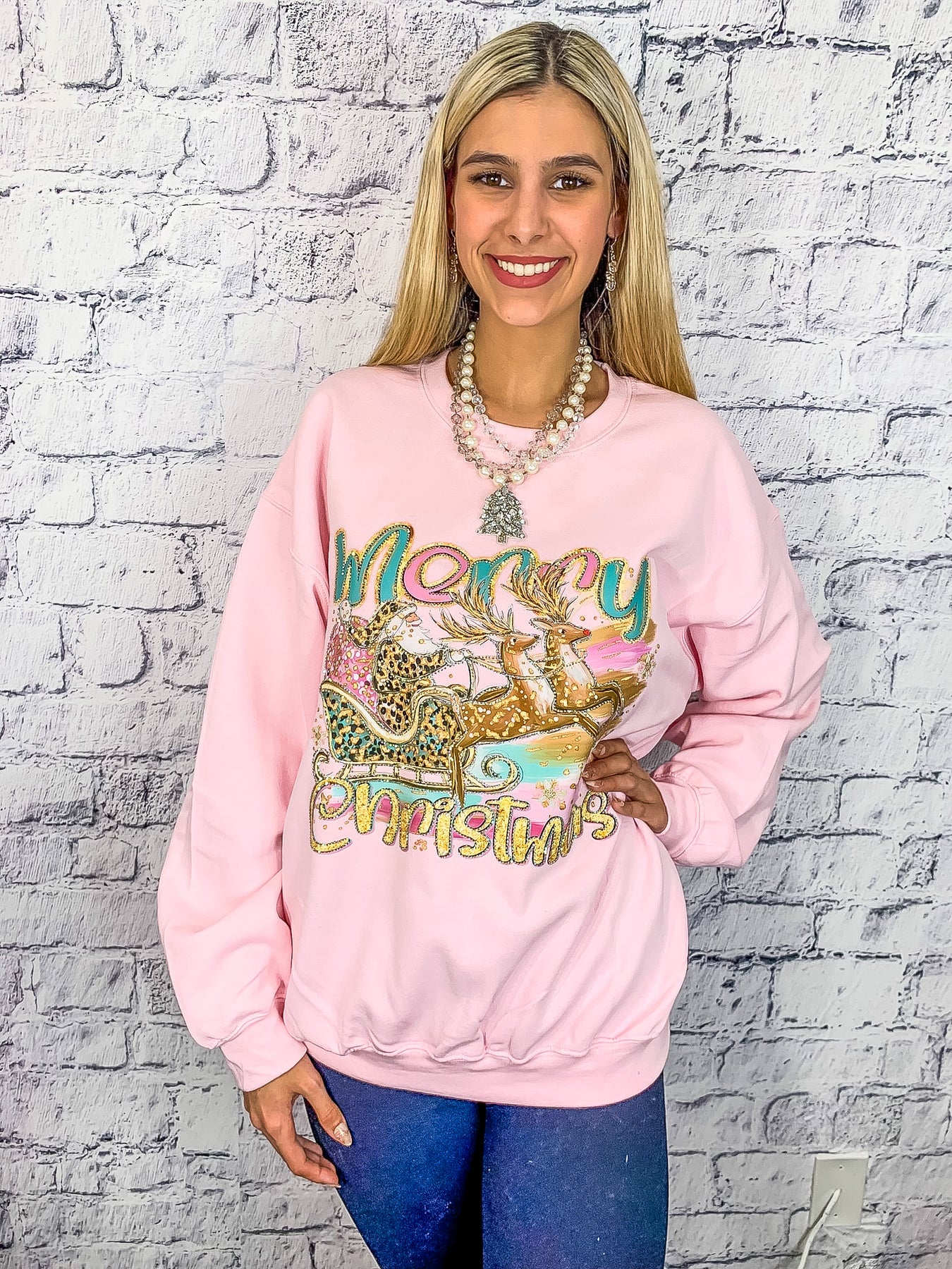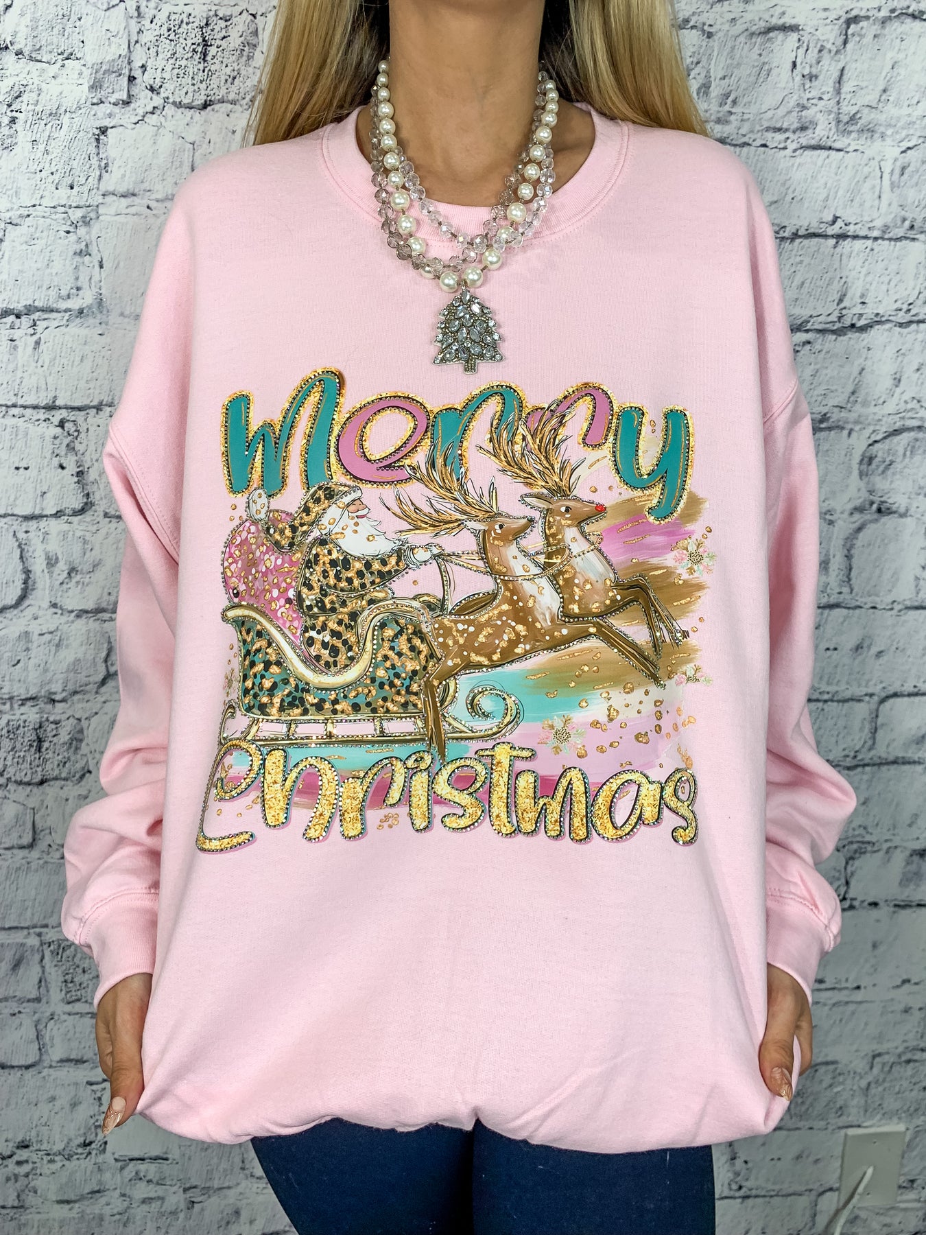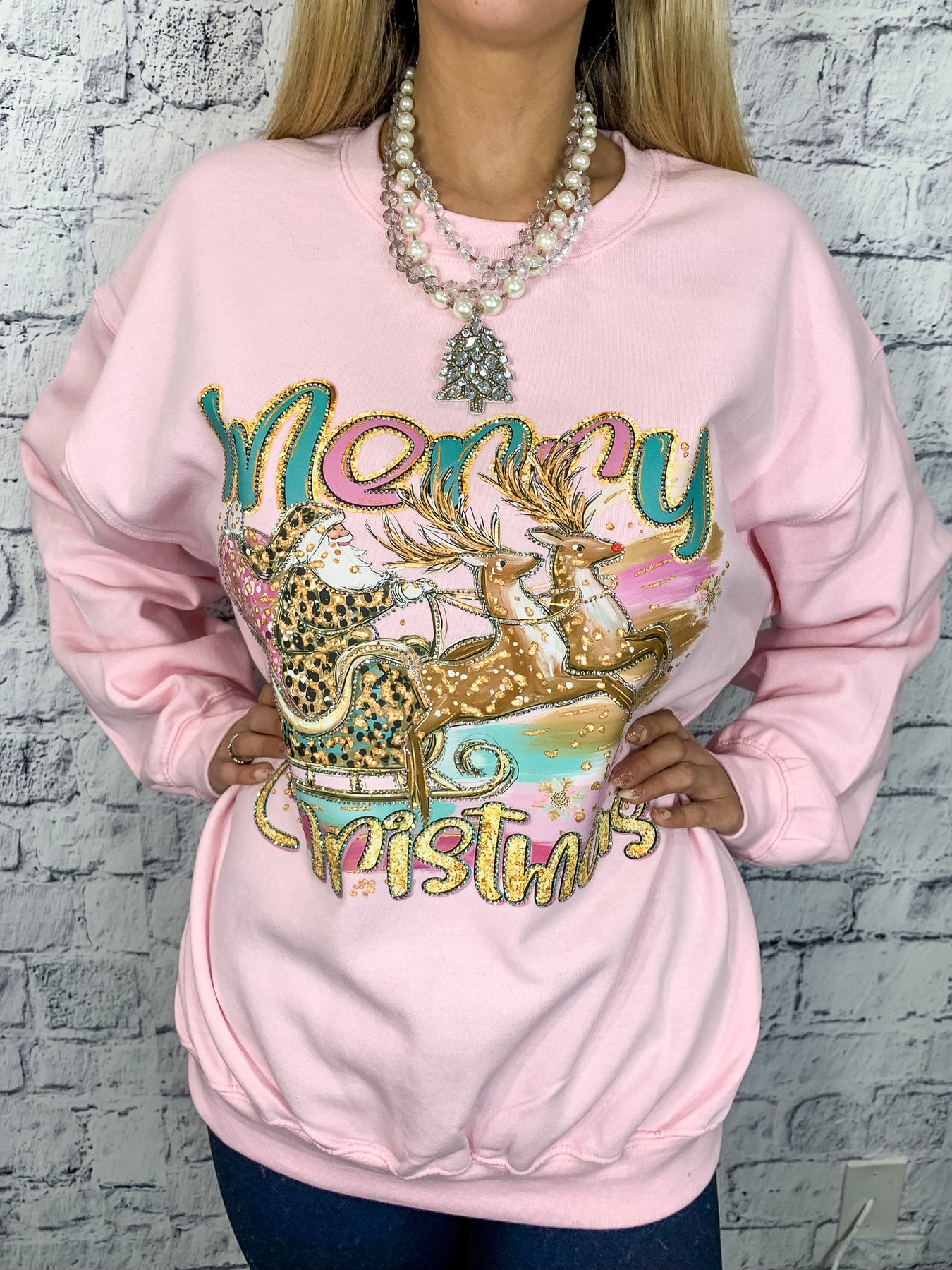 Merry Christmas Leopard Santa AB Embellished Graphic Pullover - Pink