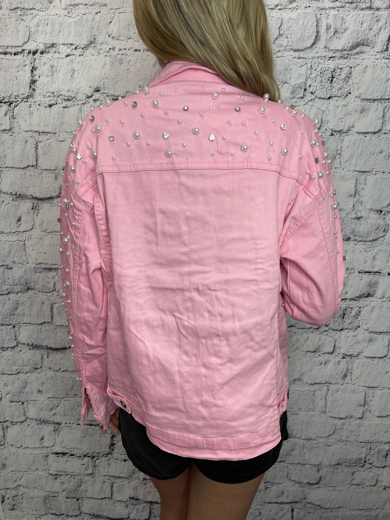 Pretty As A Pearl Rhinestone Pearl Denim Jacket - Pink
