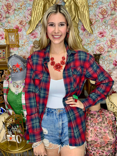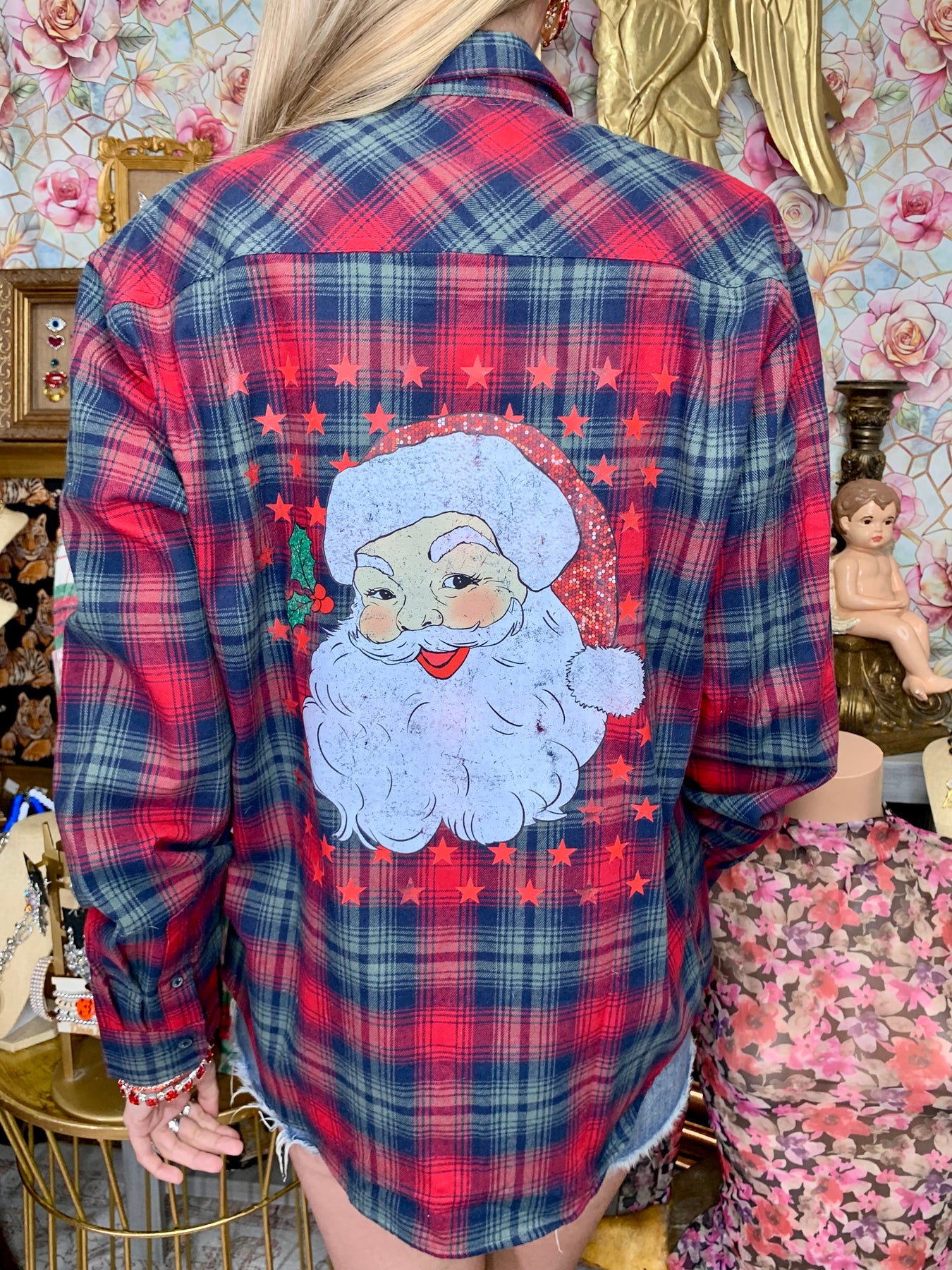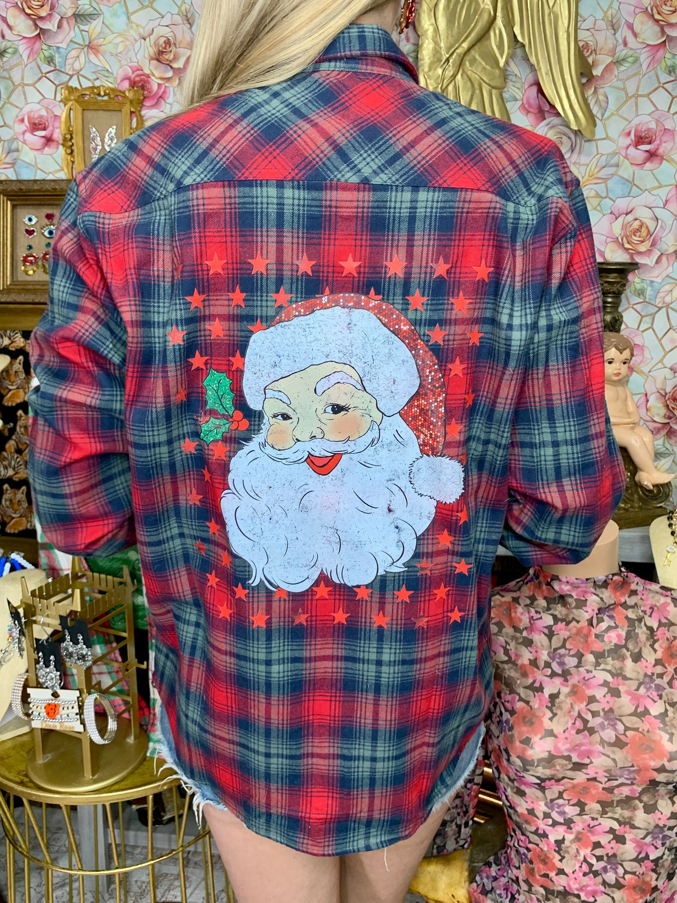 Santa Star Plaid Flannel Graphic Button Up Top - Red/Green