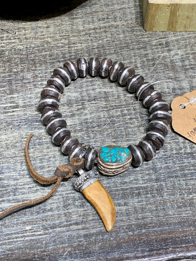 Tibetan Sterling Silver Natural Turquoise African Silver Lined Bead and Bone Bracelet