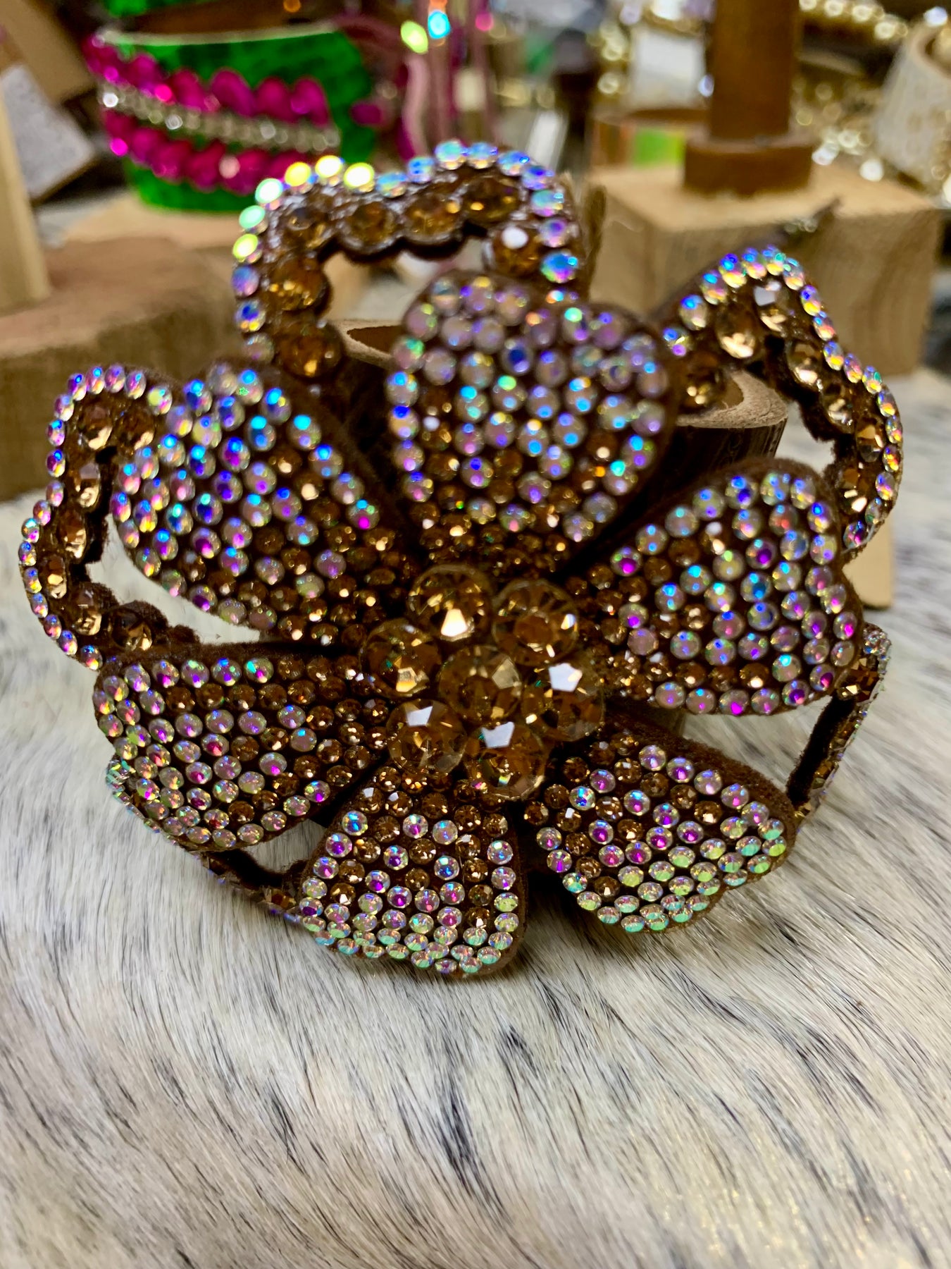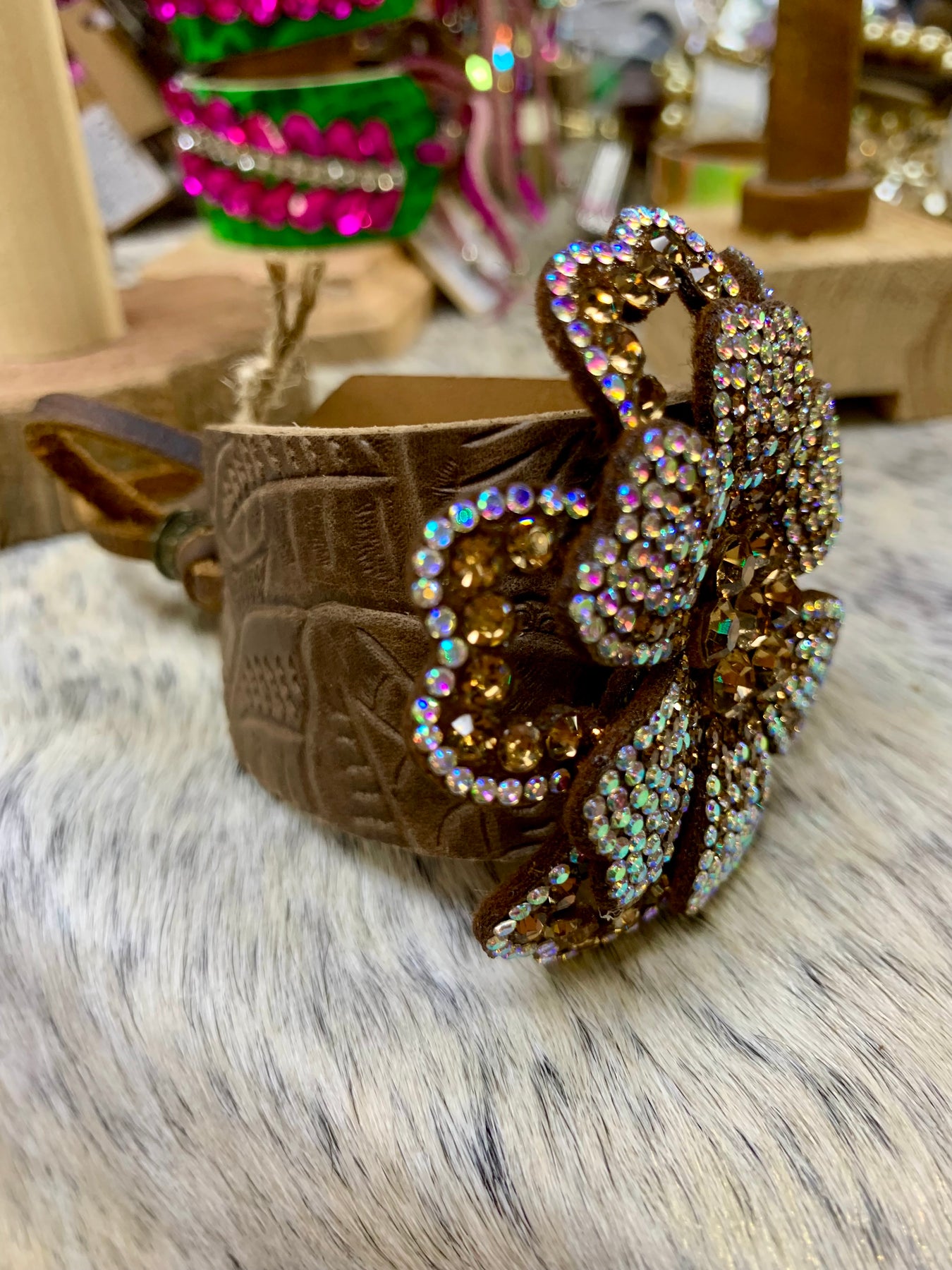 Bling Flower Tooled Leather Cuff - Brown Mix