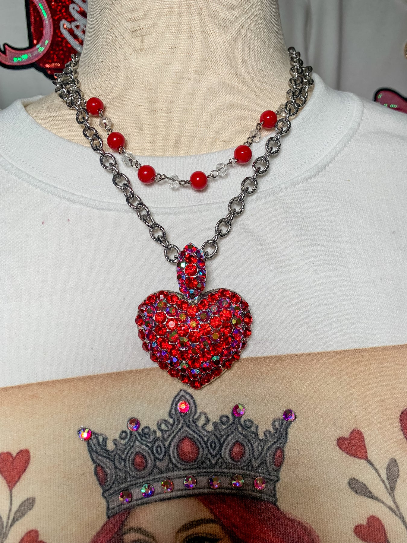This one-of-a-kind layered necklace is handcrafted using thoughtfully upcycled elements, giving new life to vintage and modern treasures. Featuring a sparkling bling heart centerpiece, this statement piece is designed to add the perfect touch of romance, glam, and personality to any outfit.