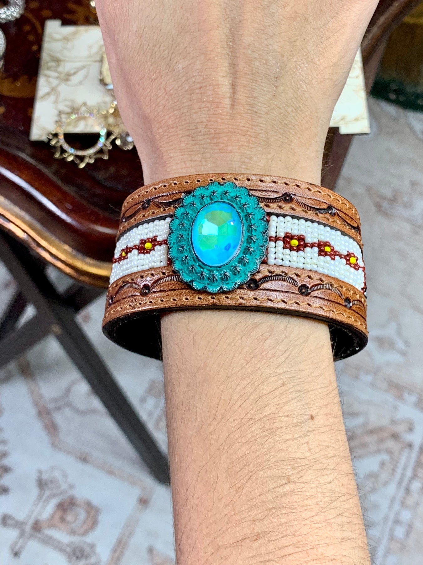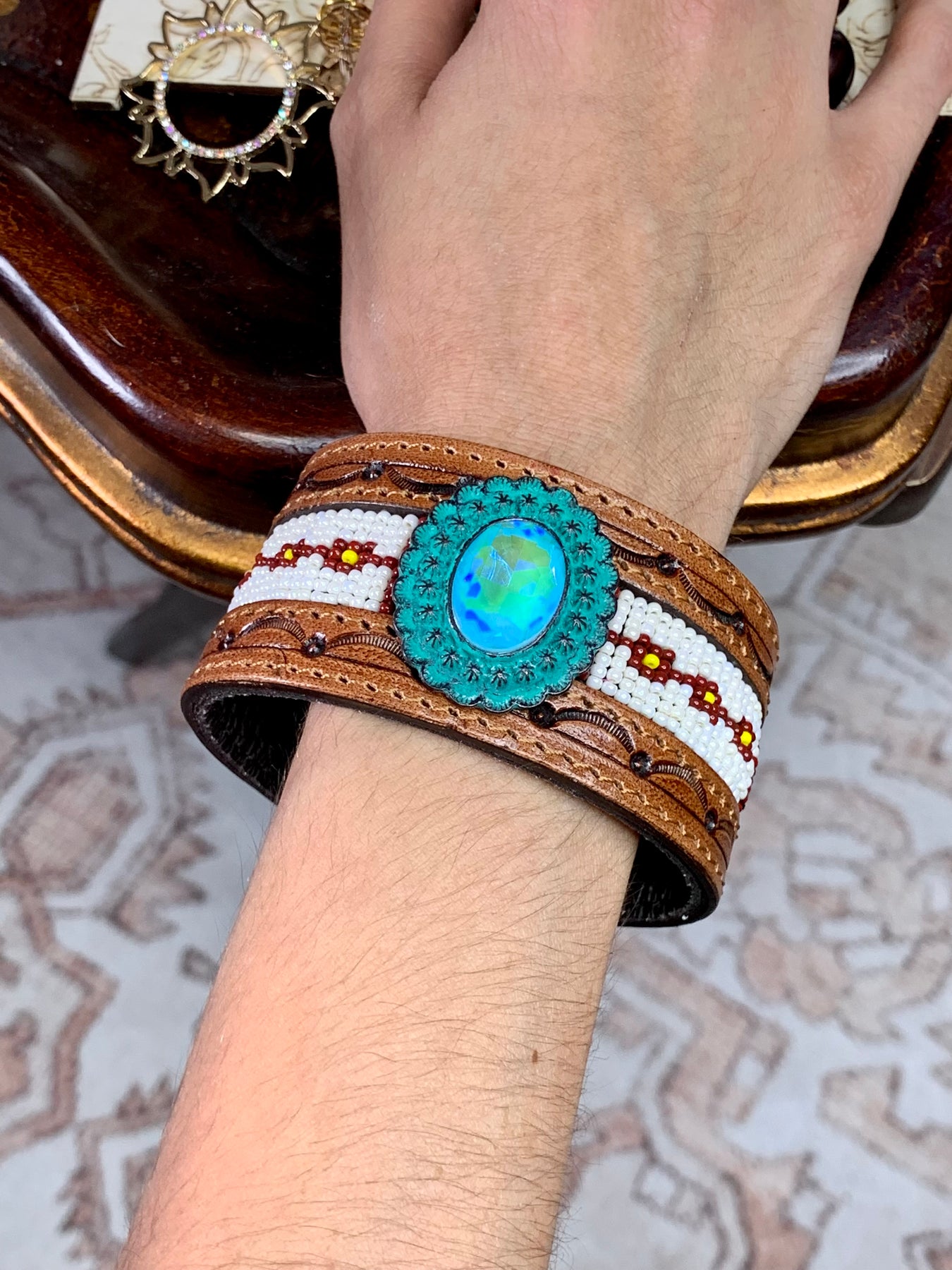 Patina Turquoise Pendant Aztec Beaded Leather Cuff
