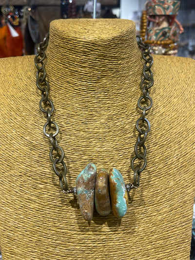Triple Stone Genuine Turquoise Chain Necklace - Bronze