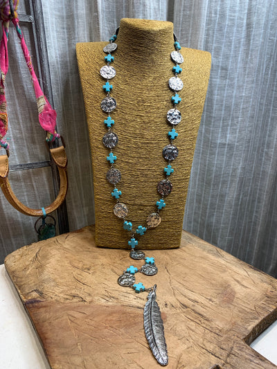 Turquoise cross hammered Indian coin Necklace