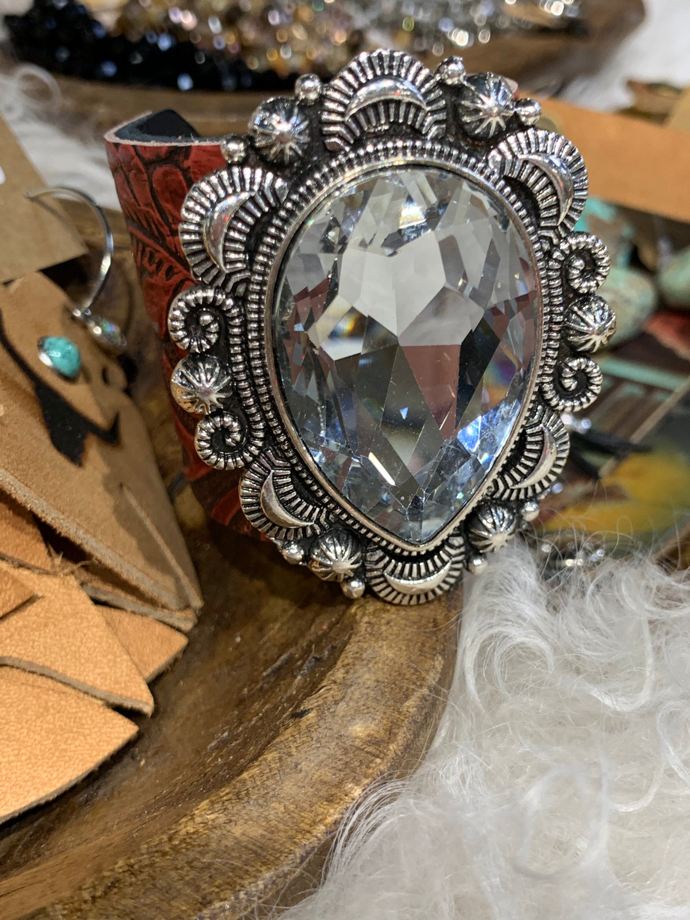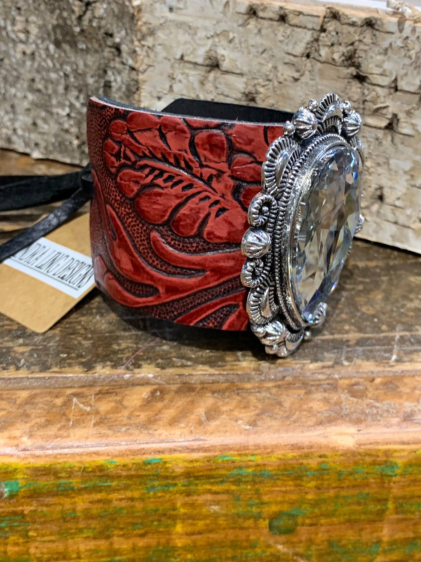 Clear Crystal Upcycled Tooled Leather Cuff - Red