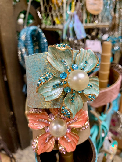 Pearl Flower Pendant Leather Cuff - Turquoise