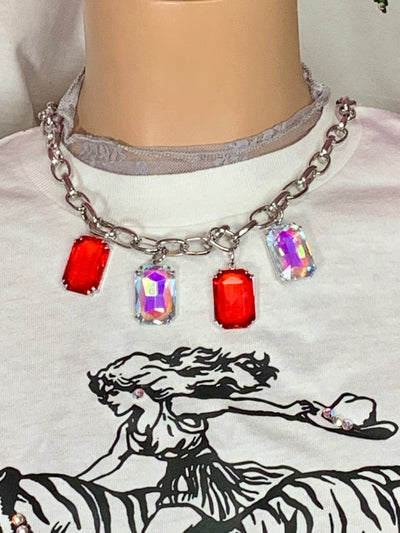 Rectangle Crystal Charm Chain Necklace - Red/AB