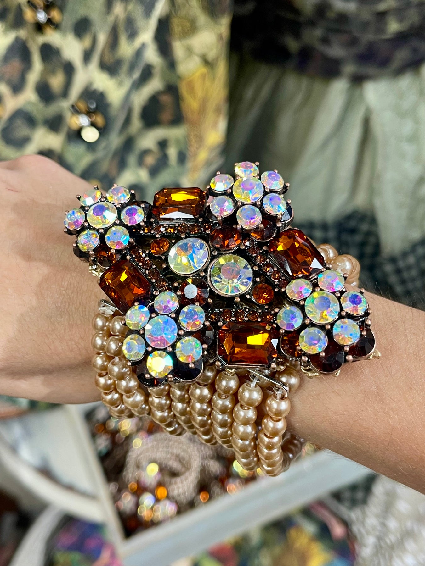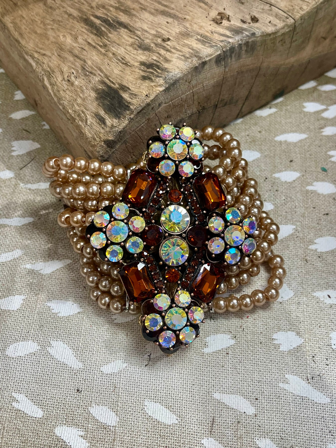 A Rare Bird Cognac AB Crystal Cross multi strand golden pearl bracelet- neutral/cognac mix