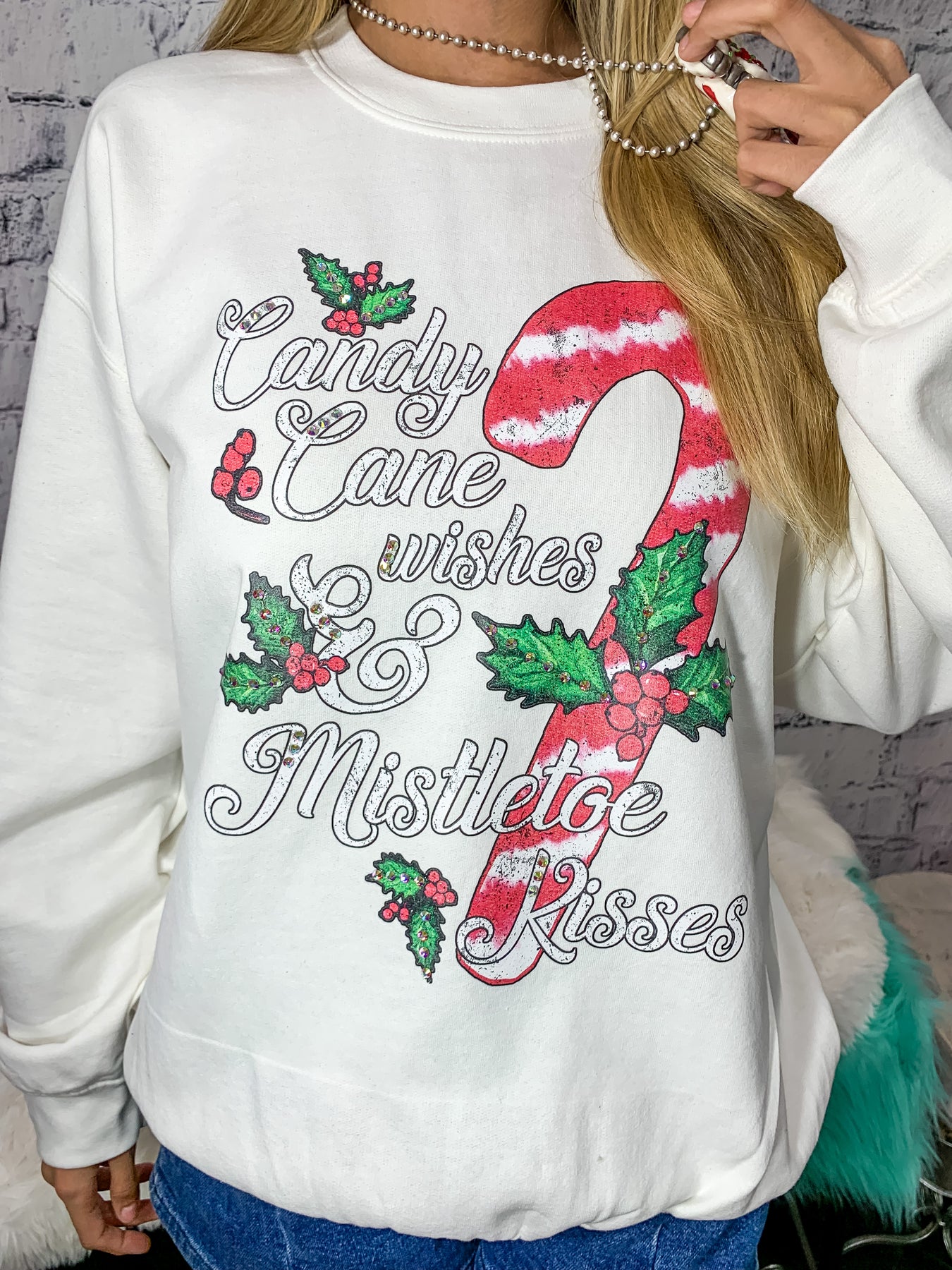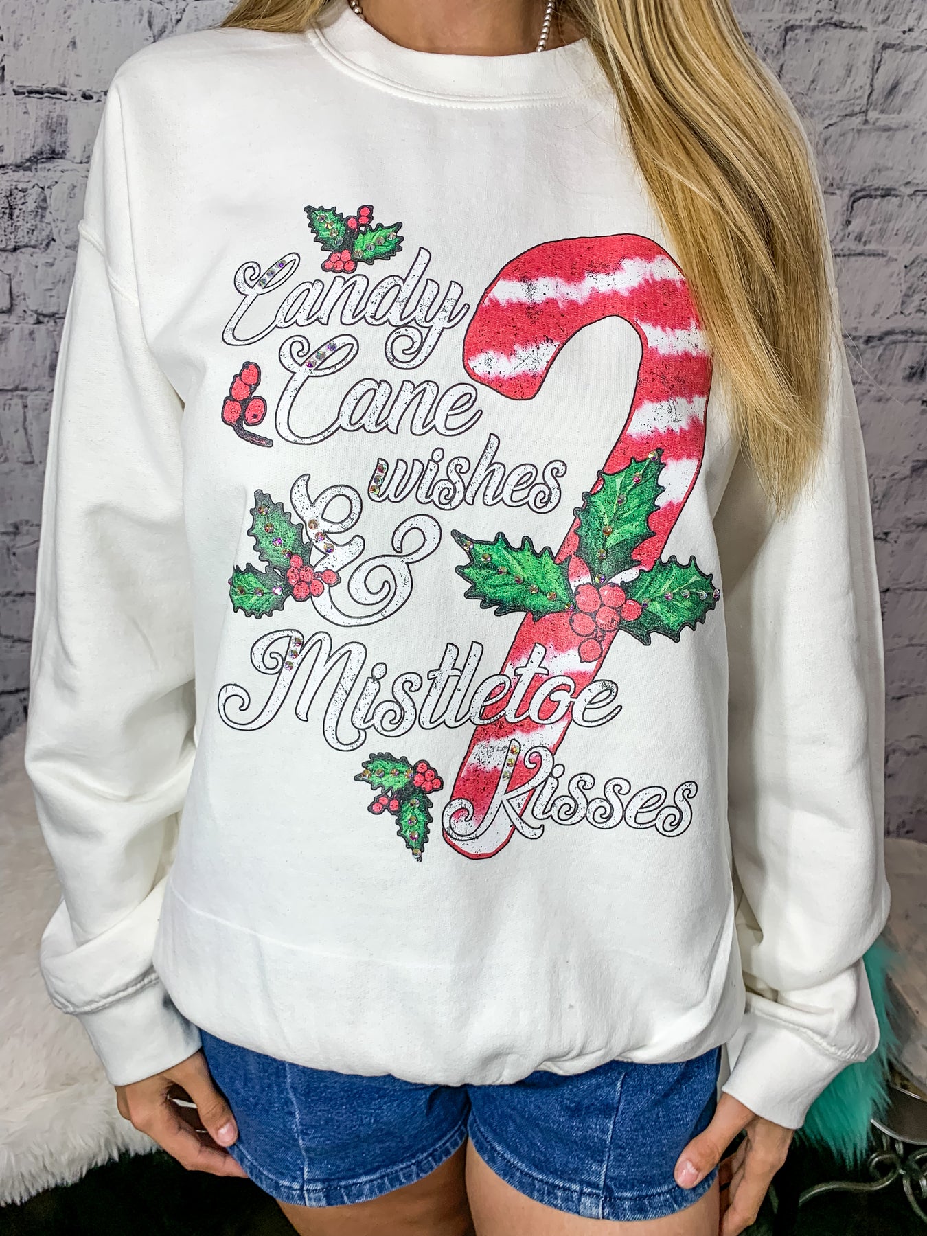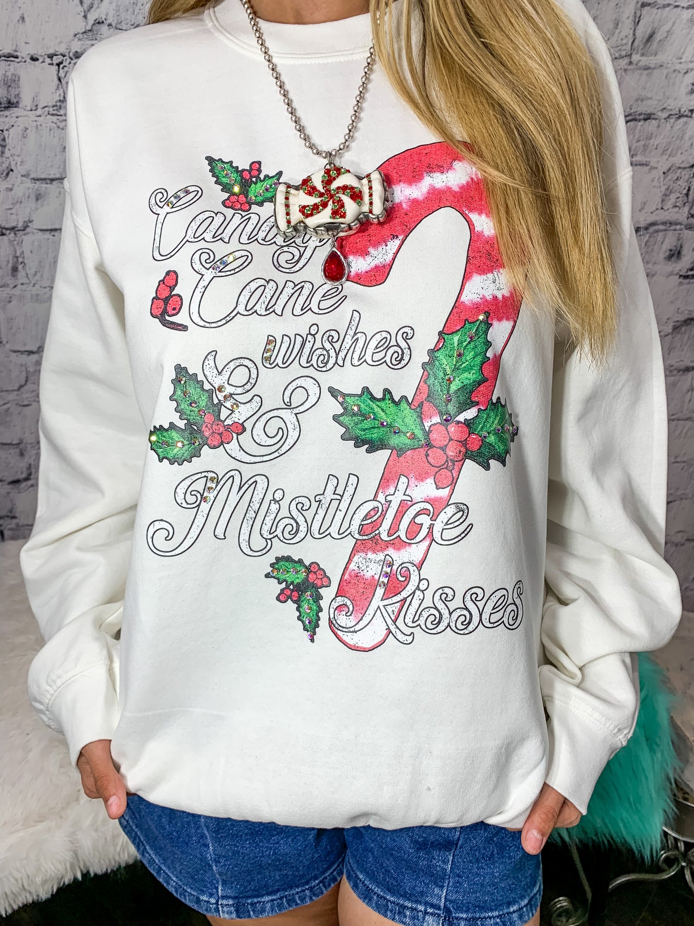 Candy Cane Wished and Mistletoe Kisses AB Embellished Graphic Pullover - White