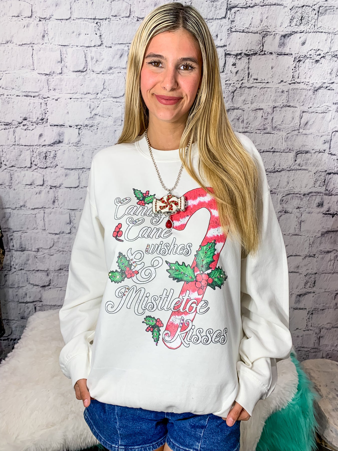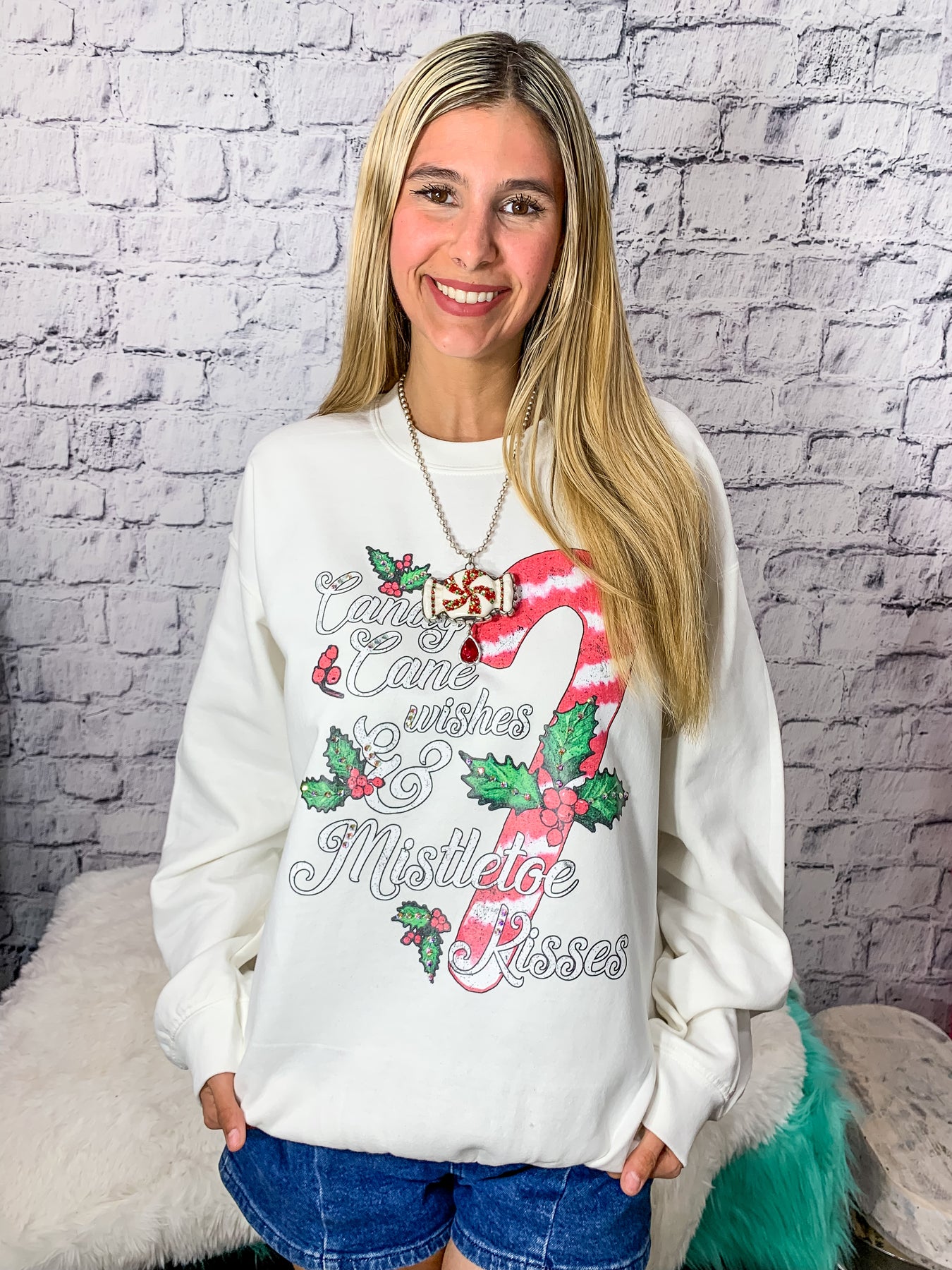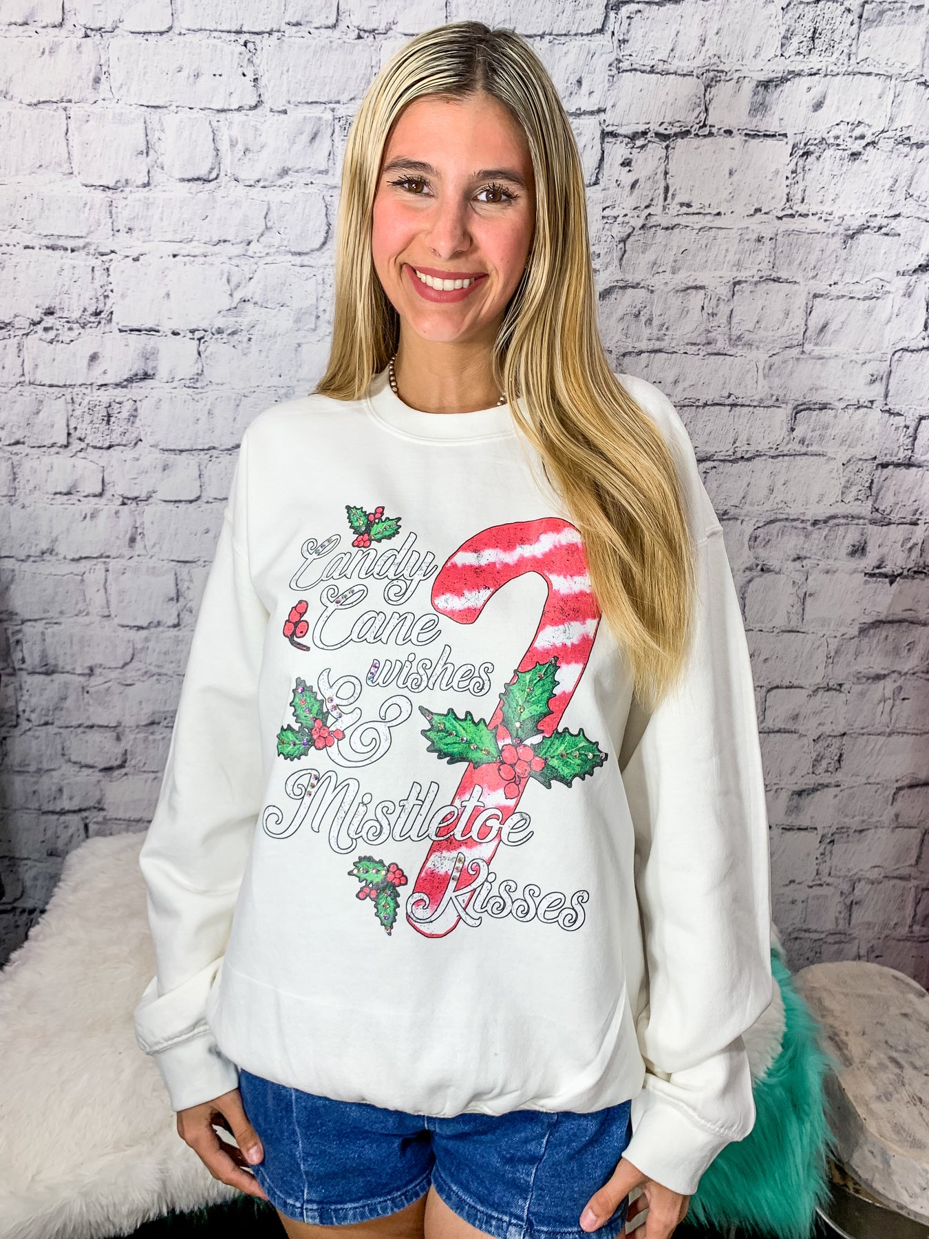 Candy Cane Wished and Mistletoe Kisses AB Embellished Graphic Pullover - White