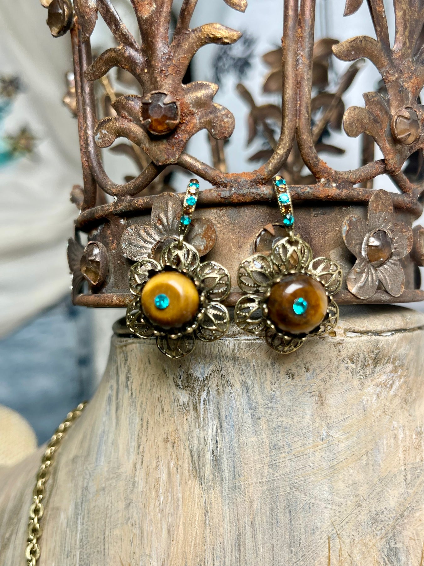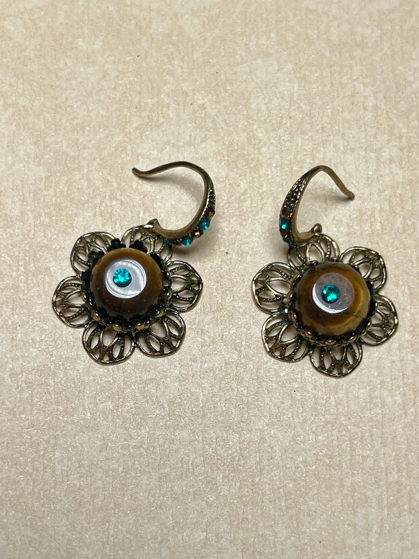 Tiger eye Detail Bling Flower Earrings - turquoise/brown