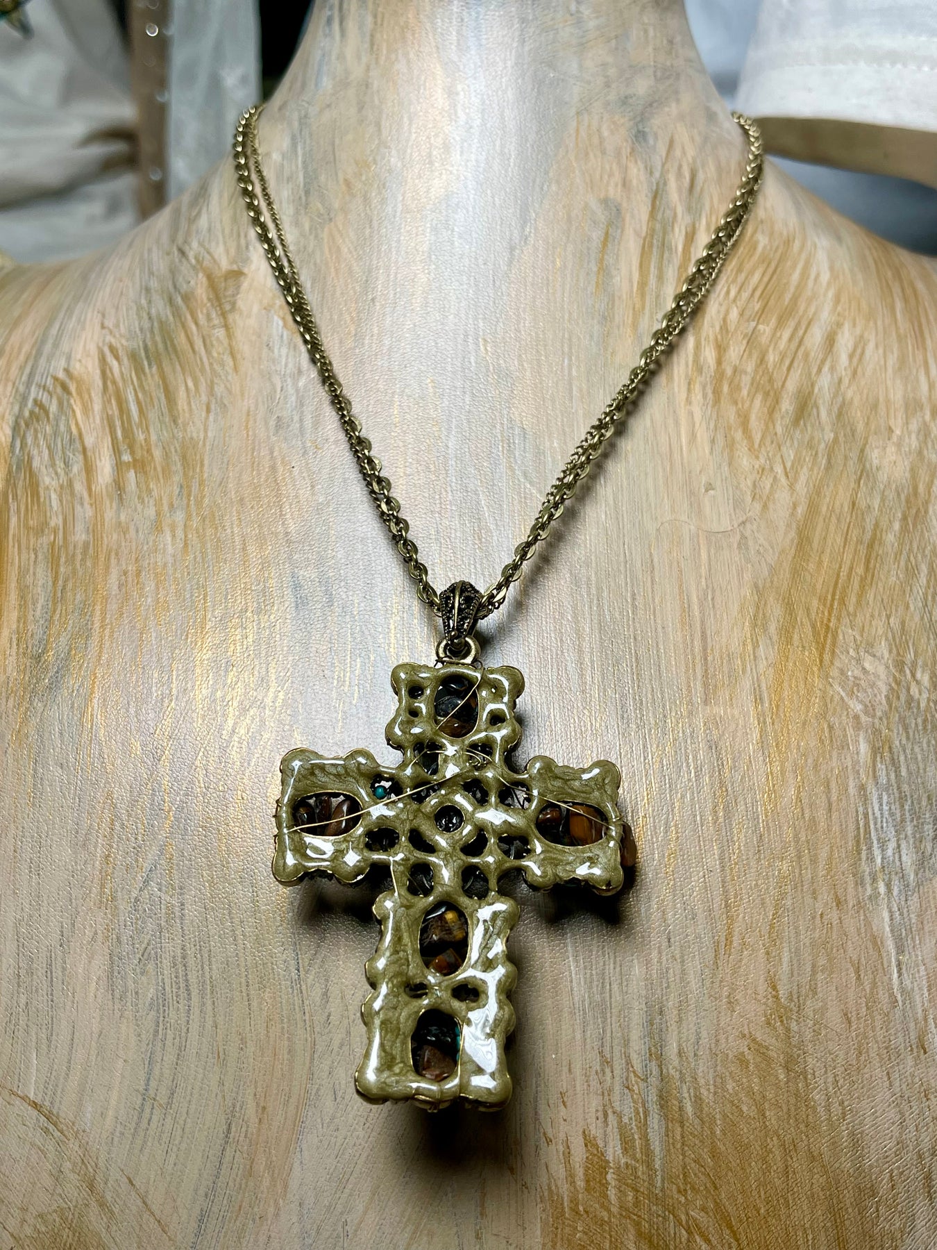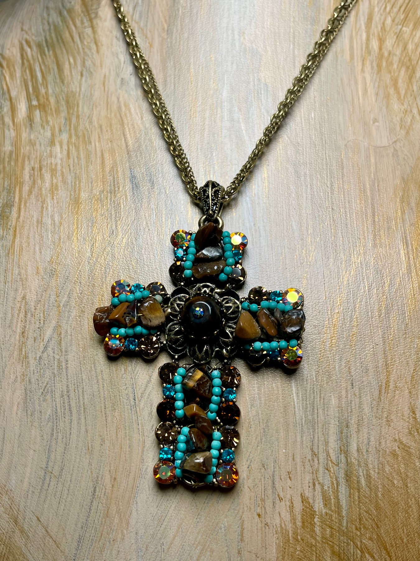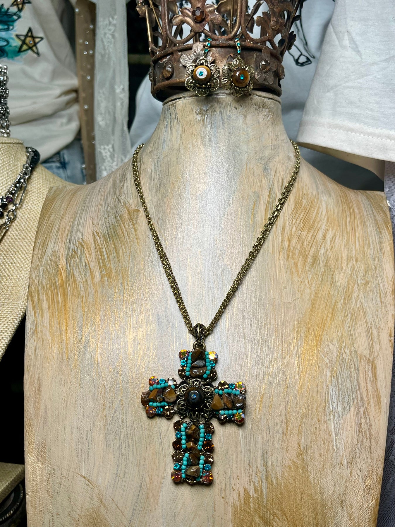 Tiger Eye Detail Cross Necklace - Turquoise/brown